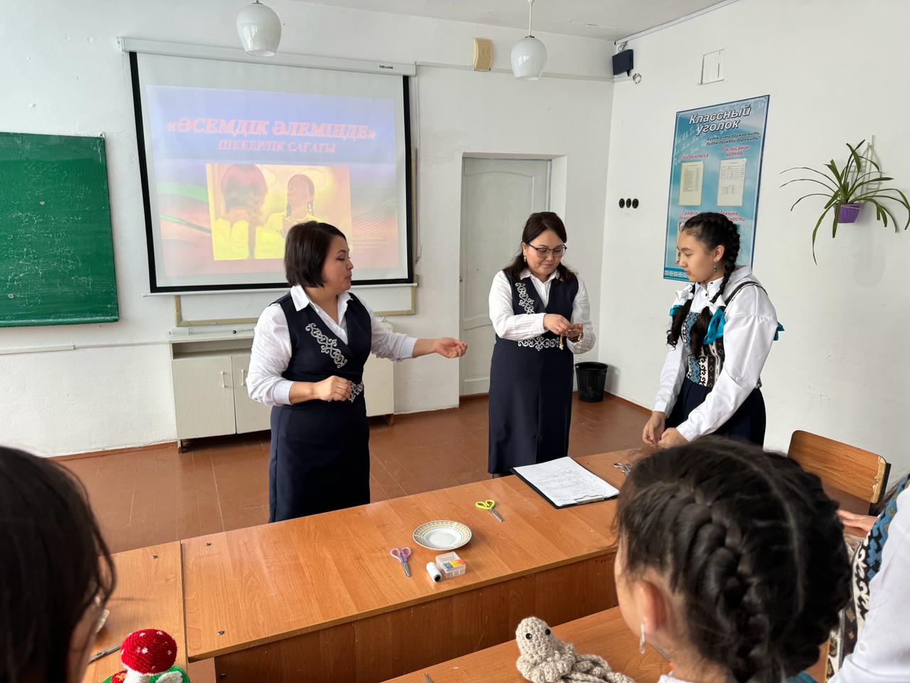2024 жылдың 12 наурыз күні "Өнерлінің өзегі талмас" апталығы аясында көркем еңбек пәнінің мұғалімдері А.С.Ермекова мен М.К.Берикканова "Әсемдік әлемінде " атты сыныптан тыс шеберлік сағатын өткізді. Іс-шара барысында психологиялық ахуалды орнатуда 7- сыныптың қыздары бір-біріне тілек айтып "Достық білезігін" тақты. Сарамандық жұмысы барысында қатысушылар таспалы шашбау тігуде өз шеберліктерін көрсетіп сән үлгісіне ұсынды, ал көрермендерге шаш күтімі, шашқа байланысты ырымдар мен тыйымдар айтылды. Шеберлік сағатына оқушылар белсене қатысты.