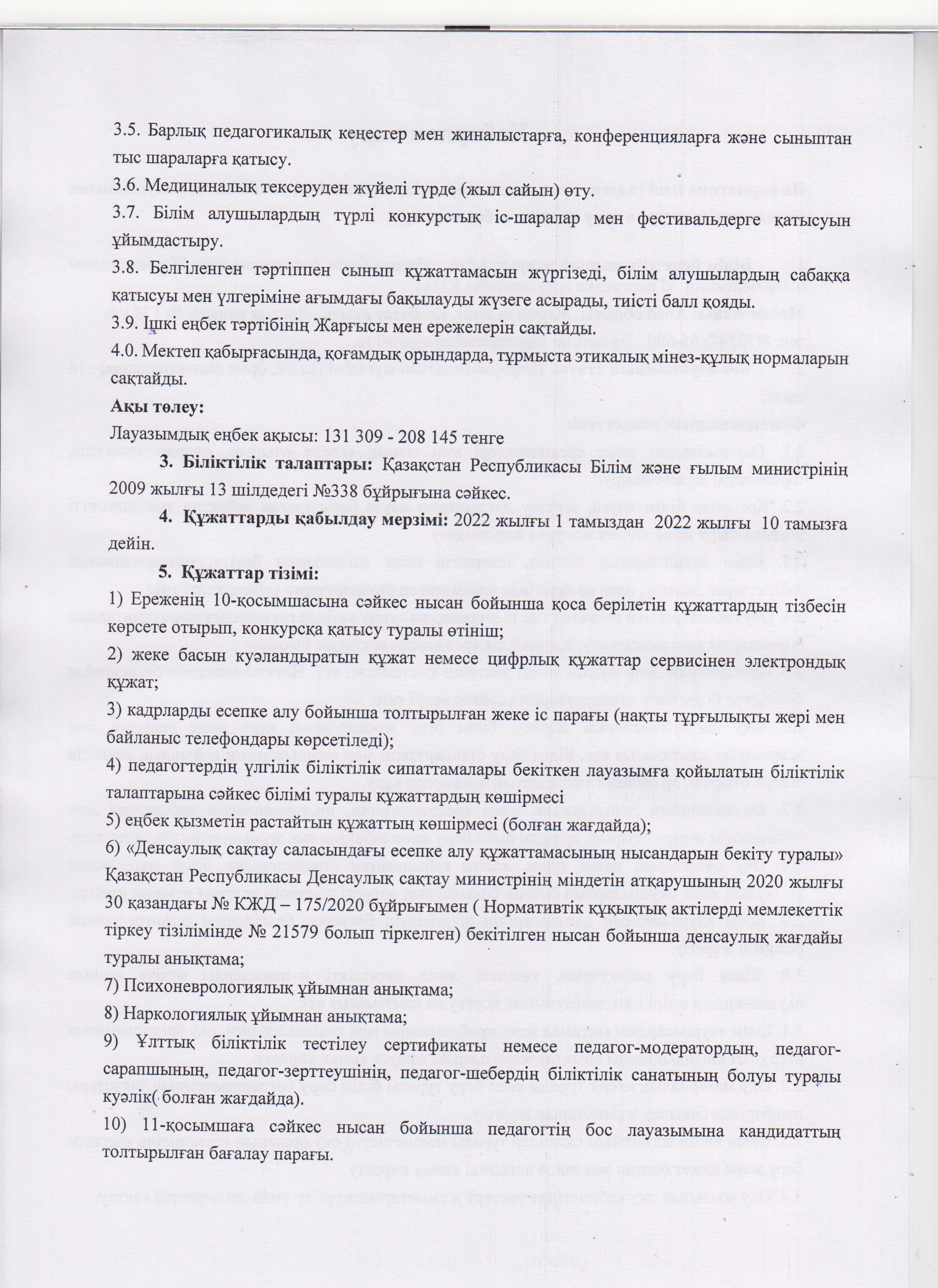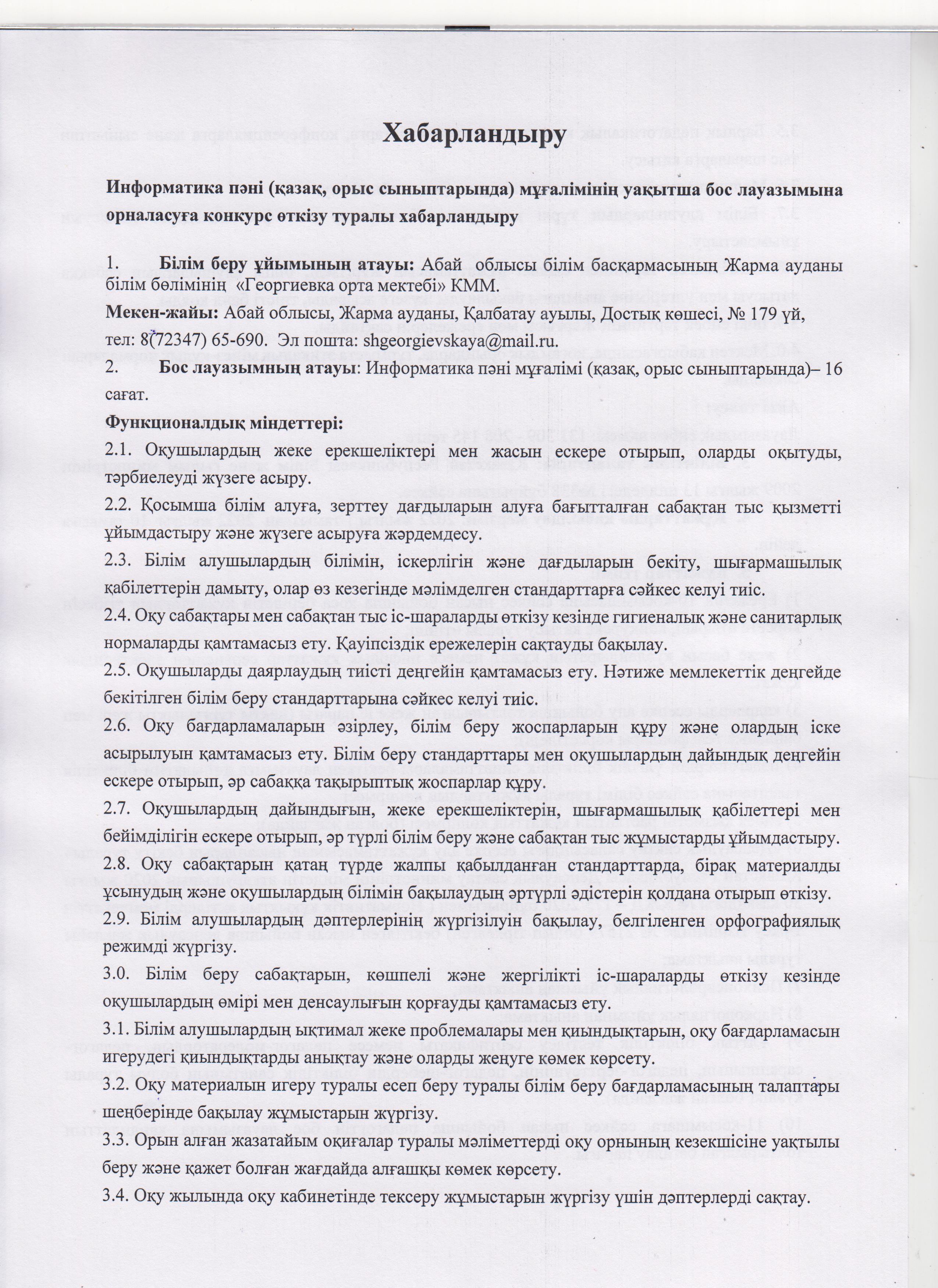 Бос лауазымға хабарландыру » «Георгиевка орта мектебі» КММ