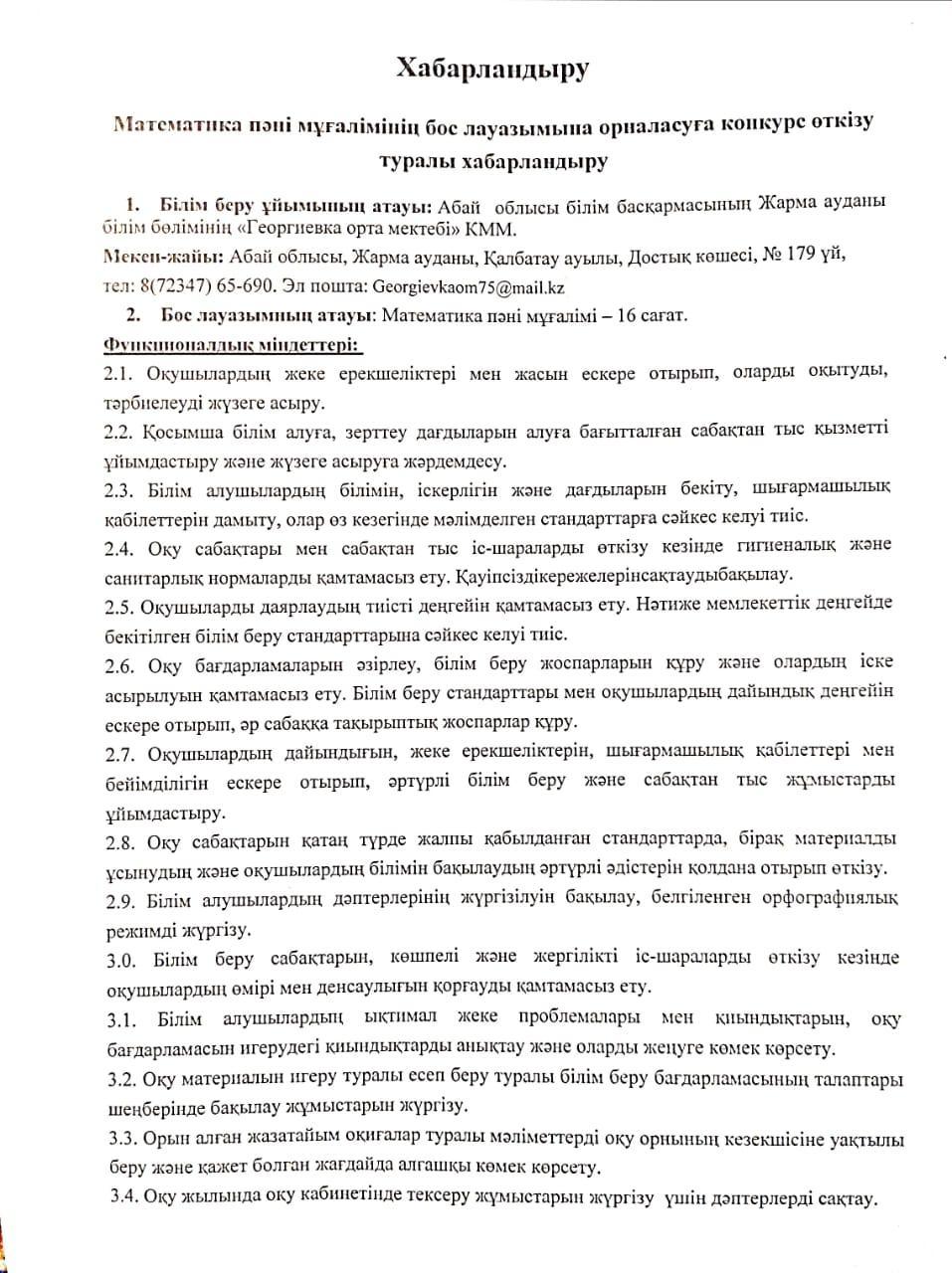 Математика пәні мұғалімінің бос лауазымы бойынша конкурсқа хабарландыру » «Георгиевка орта мектебі» КММ