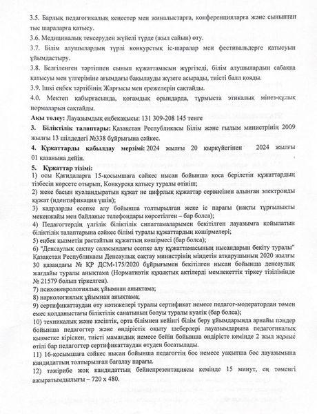 Математика пәні мұғалімінің бос лауазымына конкурс