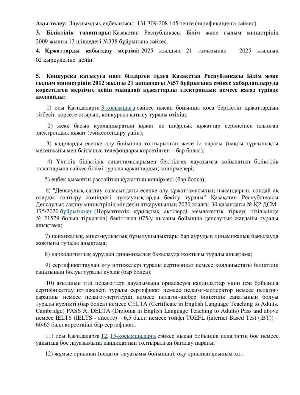 Химия пәні мұғалімінің уақытша бос лауазымына орналасуға конкурс өткізу