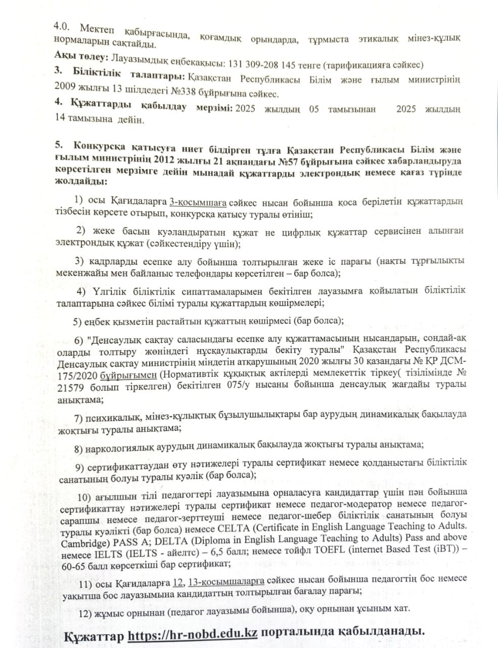 Физика пәні мұғалімінің уақытша бос лауазымына орналасуға конкурс өткізу