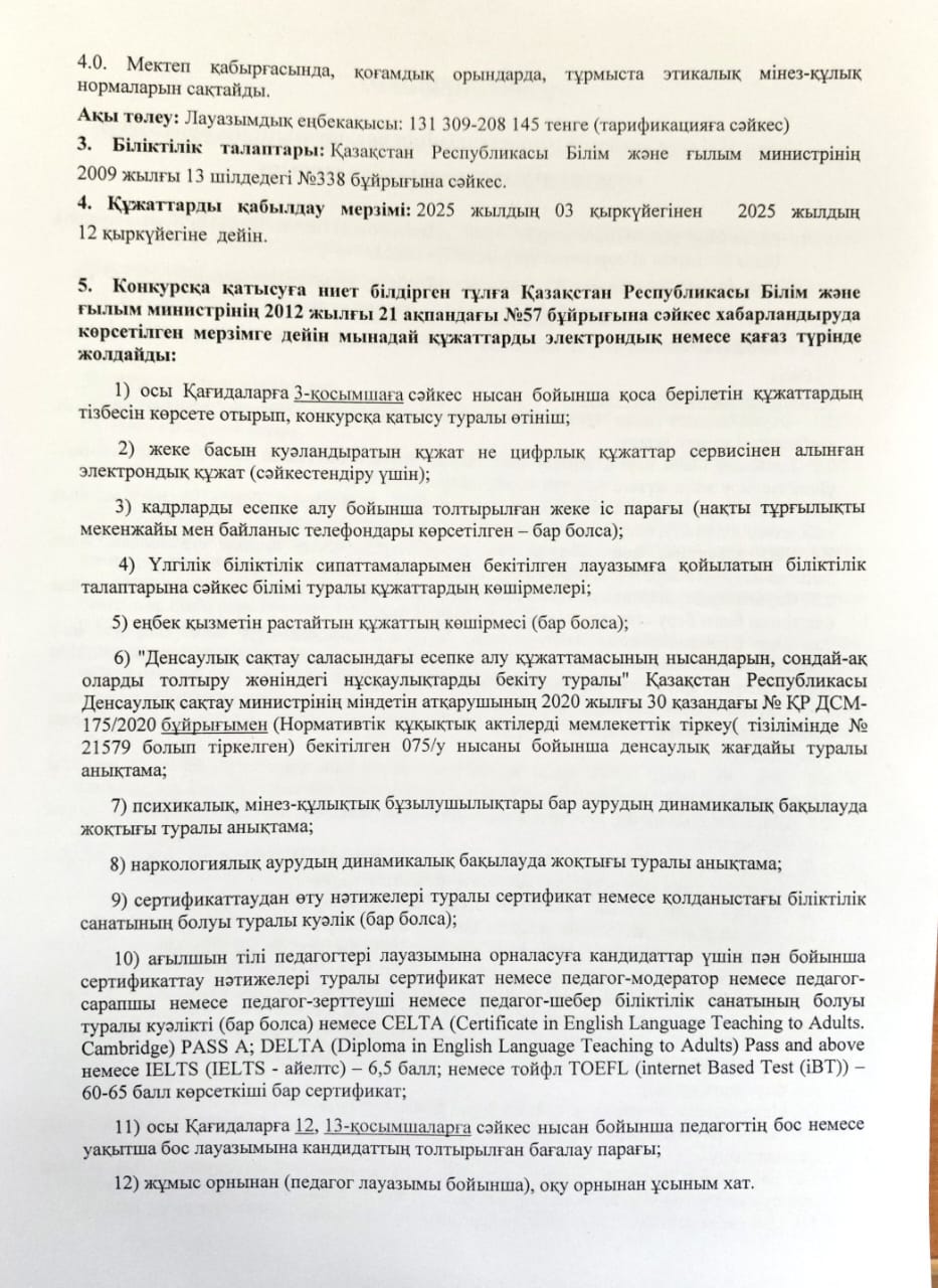 Математика пәні мұғалімінің бос лауазымына орналасуға конкурс