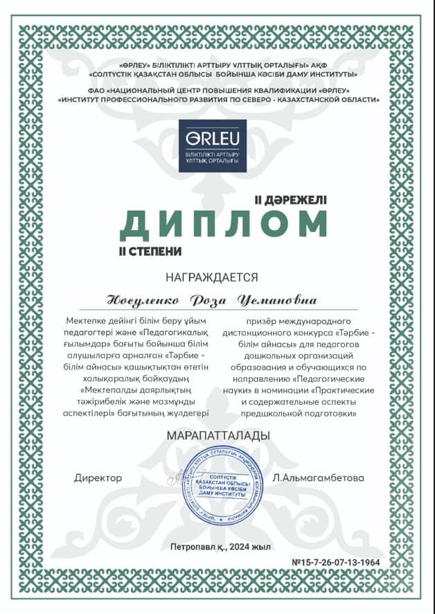 Мектепке дейінгі білім беру педагогтеріне арналған "Тәрбие- білім айнасы" халықаралық байқауында "Мектепалды даярлықтың тәжірибелік және мазмұнды аспектілері" бағыты бойынша Носуленко Роза Усмановна қатысып, ІІ дәрежелі дипломмен марапатталды.