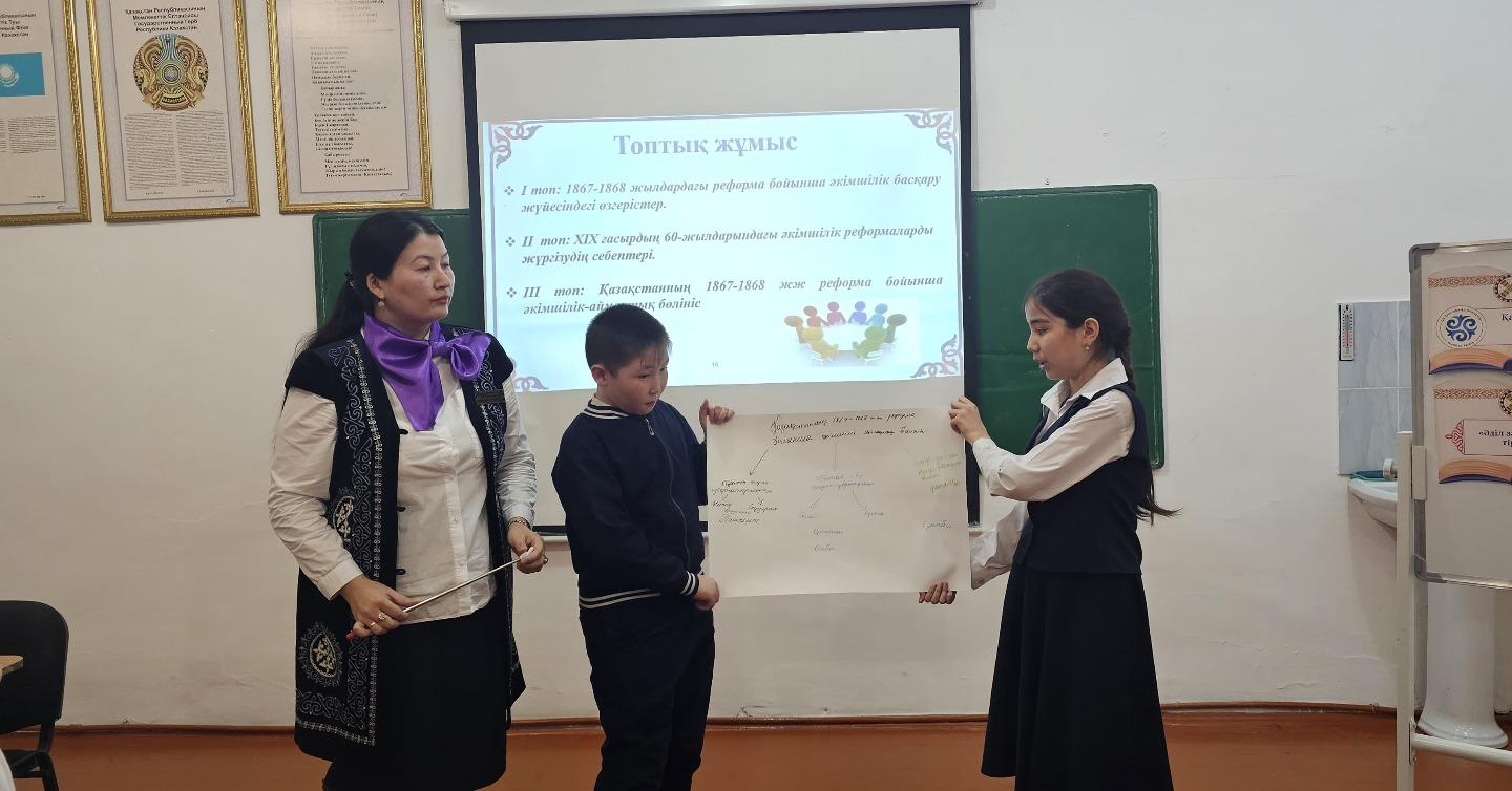 2025 жылдың 23 қаңтар күні «Тарихқа құрмет-ұрпаққа міндет!» тақырыбындағы апталық аясында тарих пәні мұғалімі Кеңесова Жібек Ғанийқызы 7 «Д» сыныбында «XIX ғасырдың екінші жартысындағы Қазақстандағы реформалар» тақырыбында ашық сабақ өткізді. Сабақ «Біртұтас тәрбие» бағдарламасы аясында «Заң және тәртіп айы» бойынша Бауыржан Момышұлының қанатты сөздерінен басталып, «Фри», «Жұмыртқа аршу», «Балық қанқасы» әдістері топтық жұмыс барысында тиімді қолданылды. Сабақ соңында «Кубок» әдісімен кері байланыс жүргізіліп, берілген тапсырмалар арқылы балалар жаңа тақырыпты толығымен меңгерді.