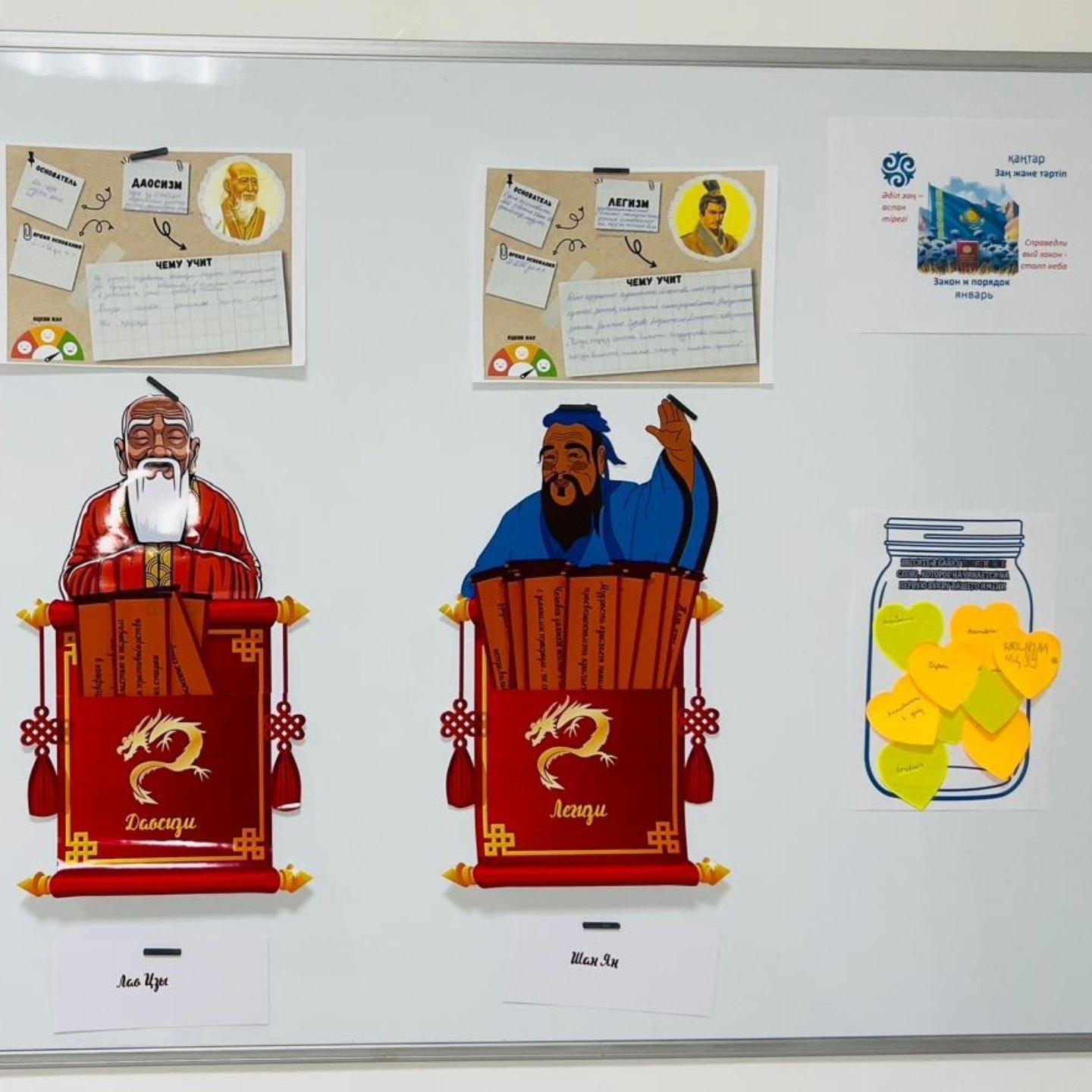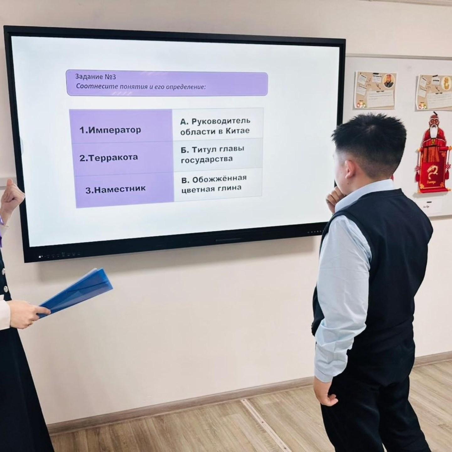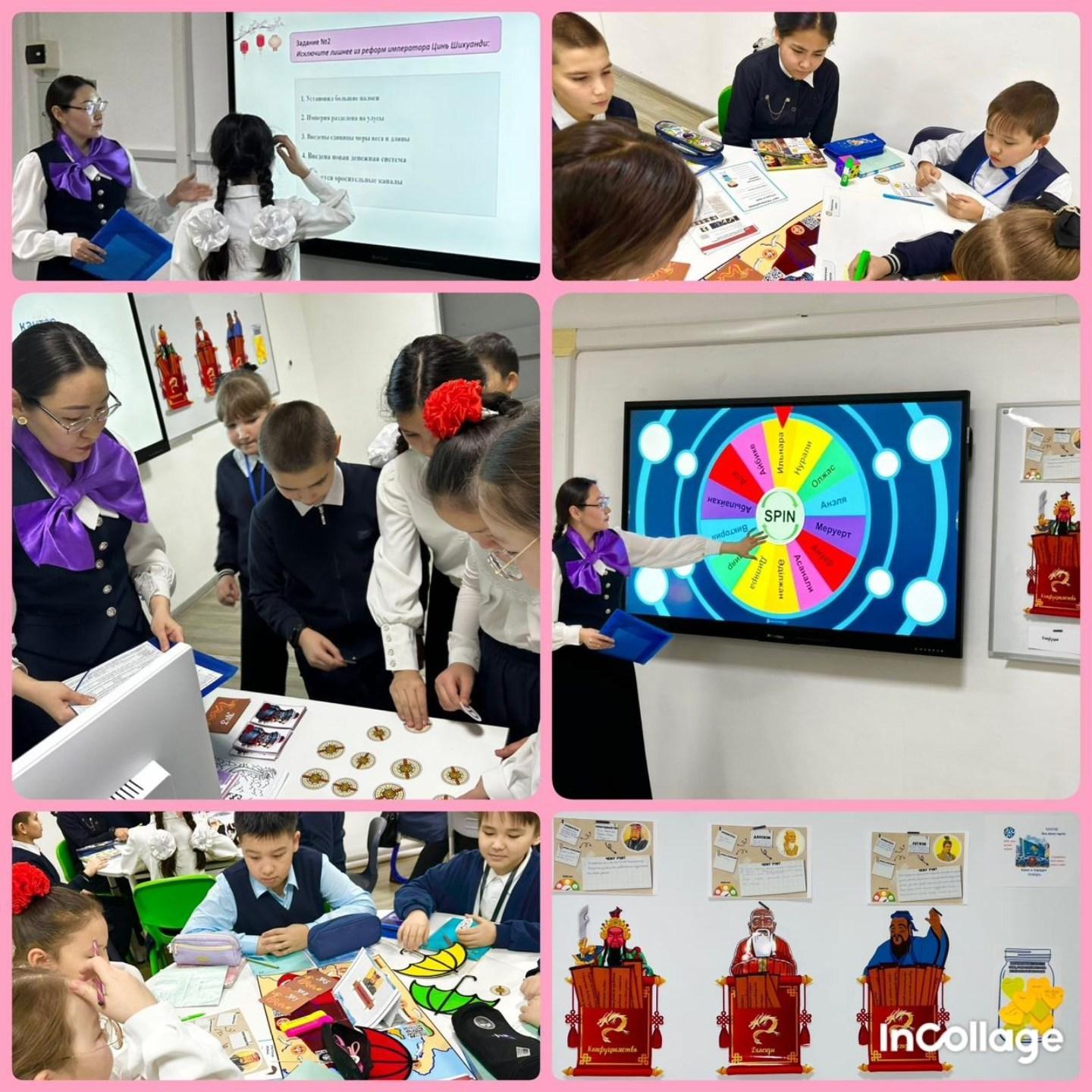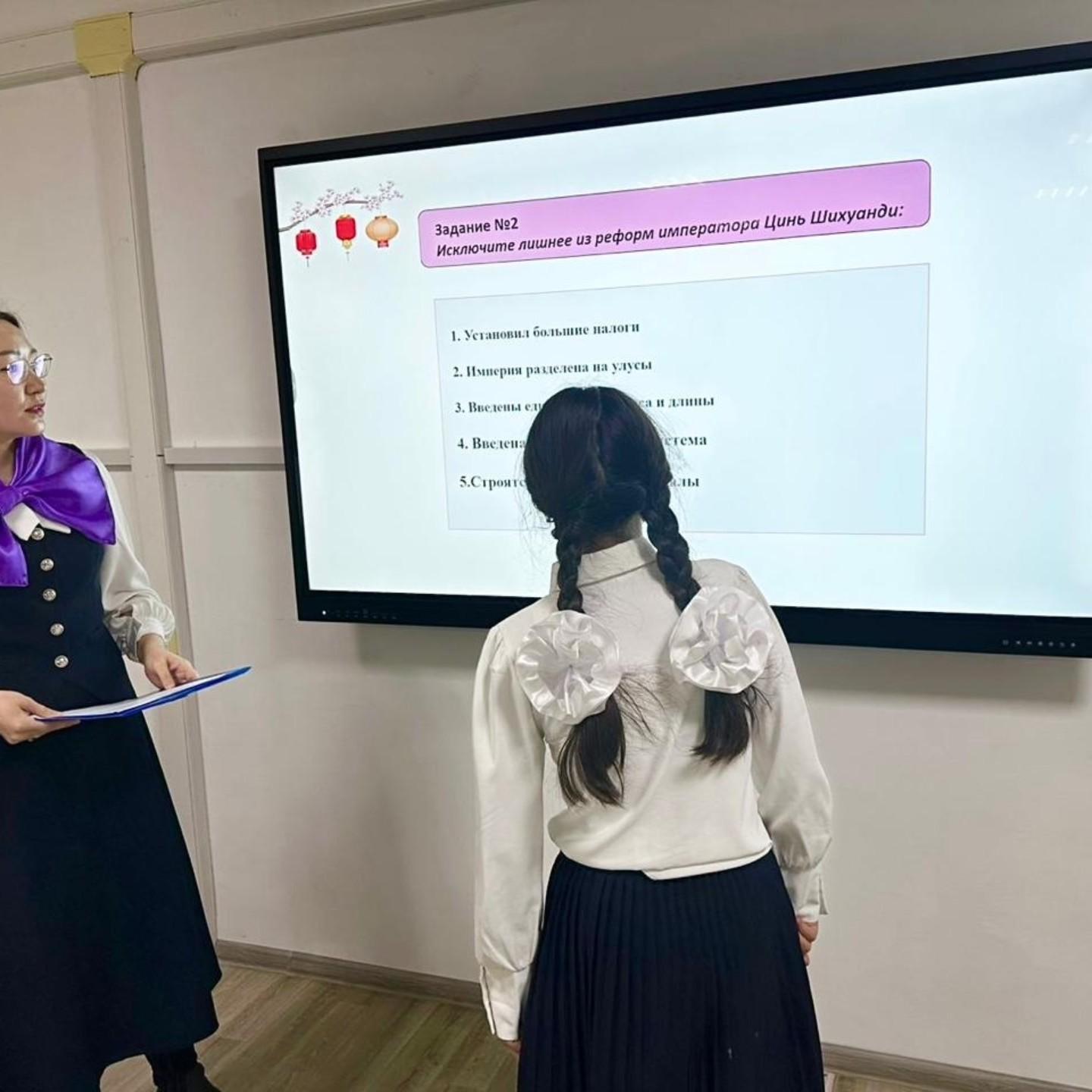 2025 жылдың 23 қаңтар күні «Тарихқа құрмет-ұрпаққа міндет!» тақырыбындағы апталық аясында тарих пәні мұғалімі Турсунова Баян Жулдузовна 5 «А» сыныбында «Терракот әскері Ежелгі Қытай туралы қандай ақпарат береді?» тақырыбында ашық сабақ өткізді. Сабақ барысында апта дәйексөзі, «Позитив құмырасы», «Қалқан әдісі», «Терракот сарбазынан терминдер», ежелгі философтардың көзқарастары туралы ақпараттар ұяшықтарға салынып, квест ойнатылып, «SPIN» арқылы оқушыны таңдау, «Ежелгі Қытай жұмыс парағы», «Табыс қолшатыры», «Рефлексия парағы» әдістері тиімді пайдаланды. Сабақ жоғары деңгейде өткізілді.