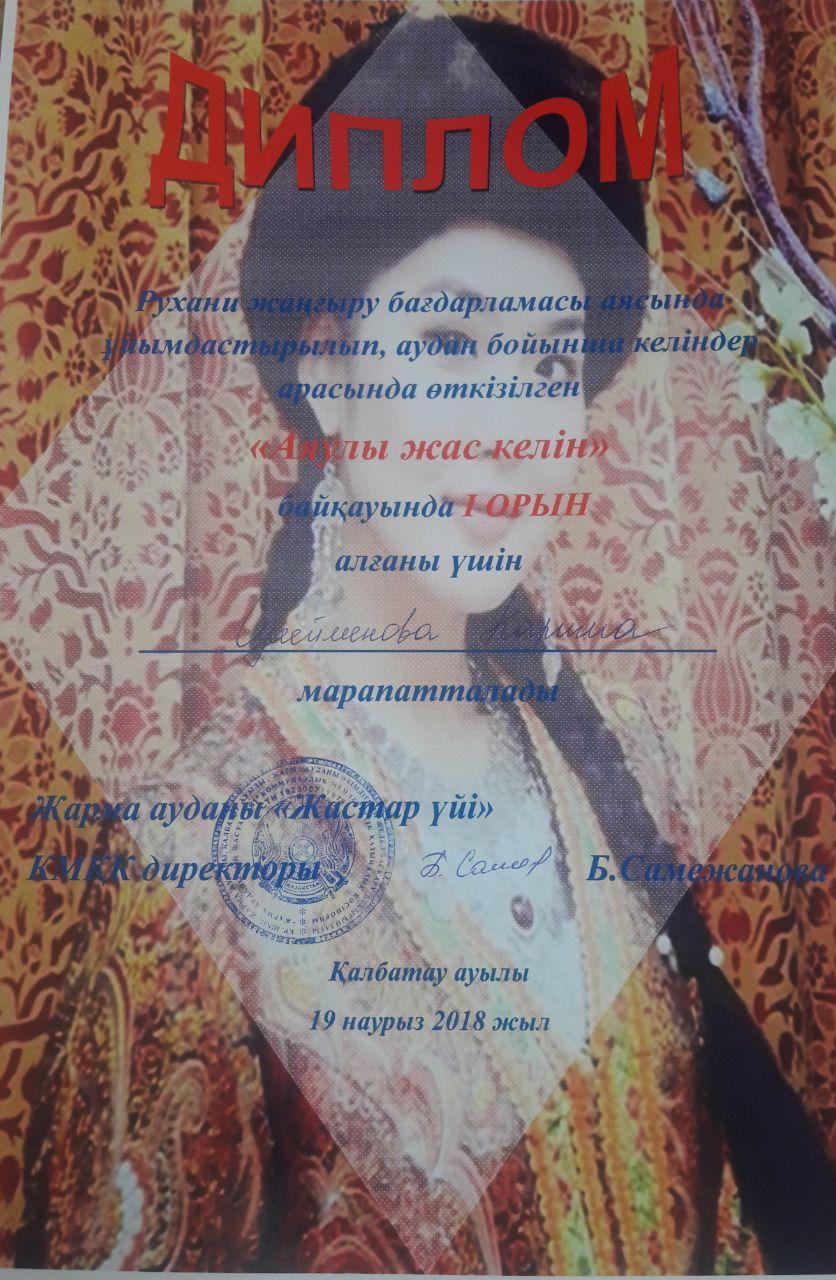 В Жарминском районе в «Доме молодежи» в рамках программы «Рухани жаңғыру» был проведен конкурс «Аяулы Жас келін», среди молодых невесток.В конкурсе приняли участие молодые невестки всего района и показали свое умение, мастерство и красноречие.Начался конкурс с номинации знакомства. В номинации на творчество и красноречие учительница английского языка КГУ «Георгиевская средняя школа» Сүлейменова Карима удивила зрителей, прочитав наизусть 200 стихотворений Абая Кунанбаева. Констатируя ,что казахский народ славится гостеприимством, конкурсанты на суд жюри представили кулинарные блюда, приготовленные собственными руками.А также отвечали на каверзные вопросы жюри .