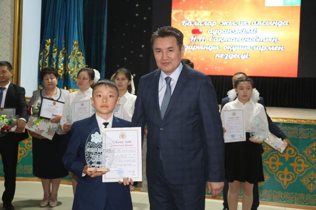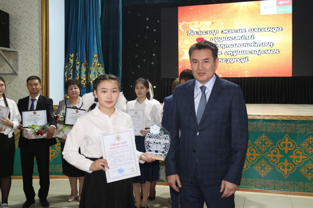 Балалар жылы аясында Жарма ауданының әкімі Нұрымбет Аманұлы Сақтағановтың дарынды оқушылармен кездесу өтті. Кездесуге мектебіміздің республикалық, облыстық деңгейде жетістікке жетіп жүрген оқушылары Құрлус Аяулым, Андраш Балнұр, Токтарбек Аружан және Есен Мақсат қатысты. Тоқтарбек Аружан мен жетекшісі Д.М.Рахимгалиев және Есен Мақсат аудан әкімі Н.Сақтағановтың Алғыс хатымен, ал  Құрлус Аяулым мен Андраш Балнұр білім бөлімінің басшысы К.Шаймуратовтың Алғыс хатымен, бағалы сыйлықтарымен марапатталды.