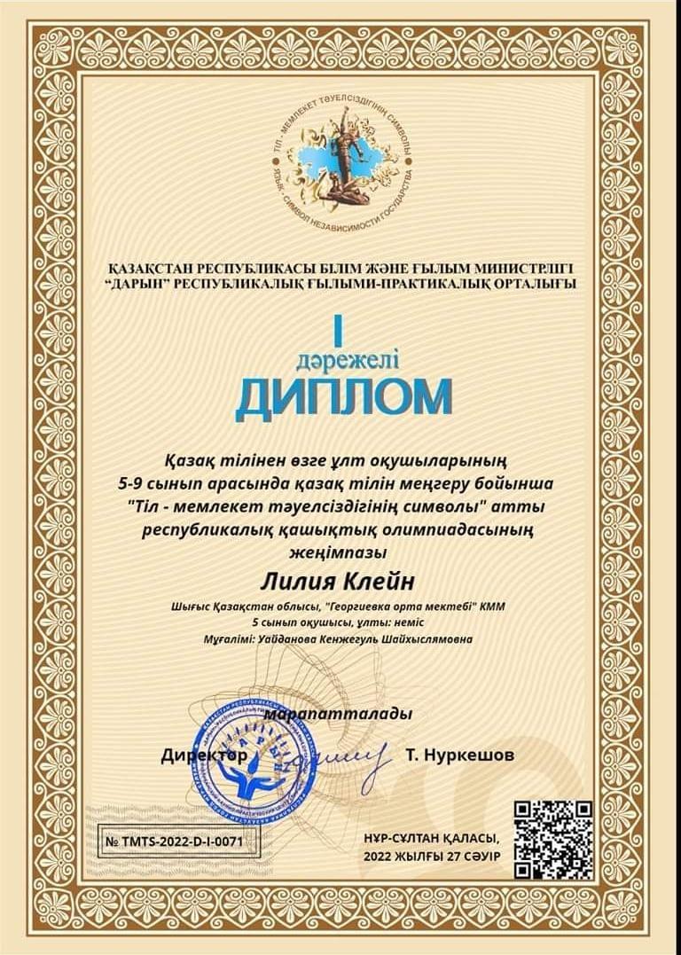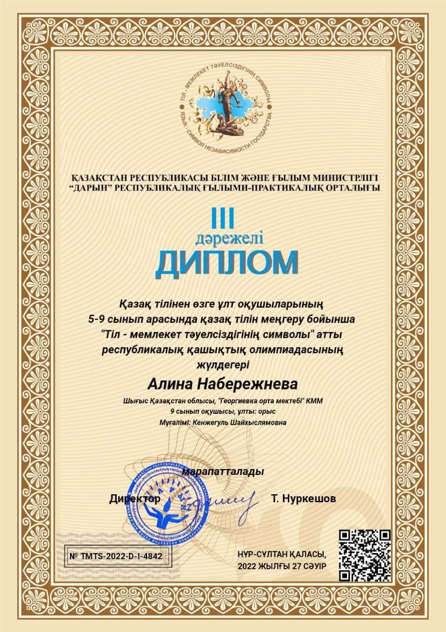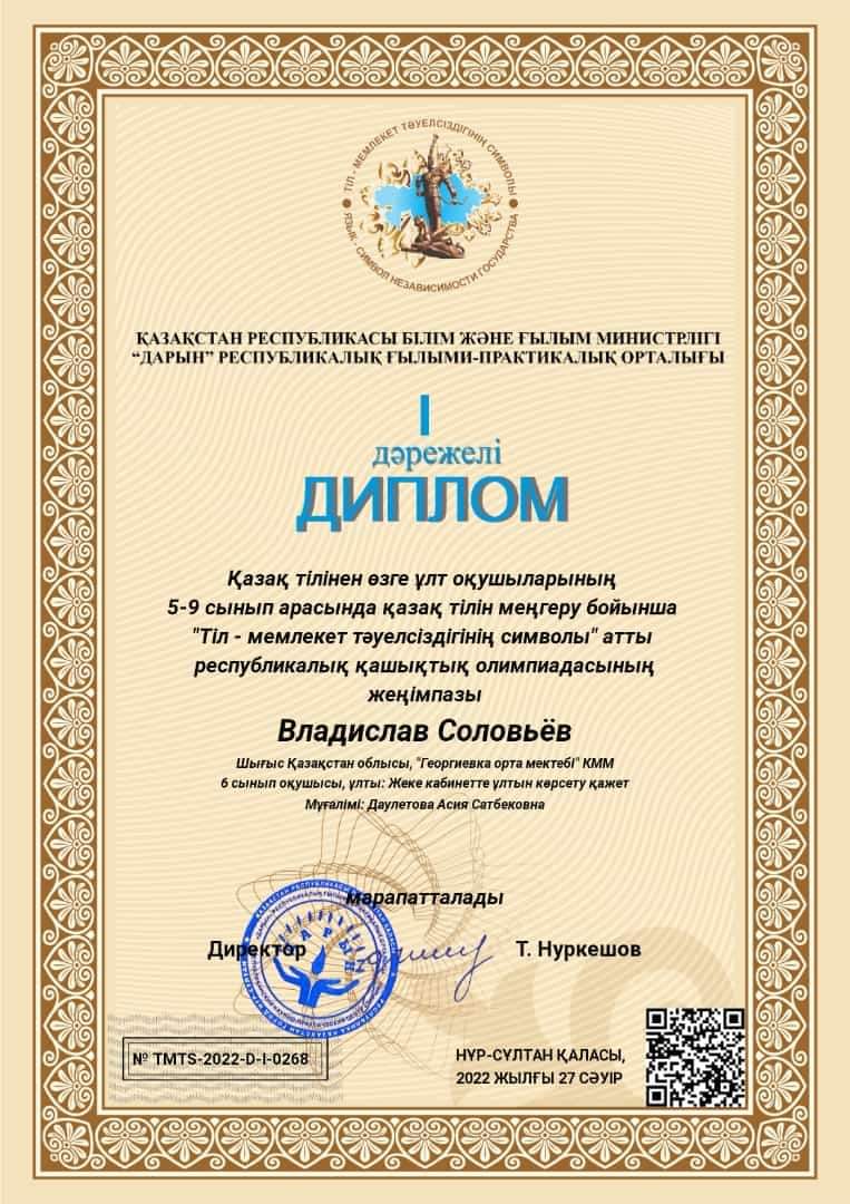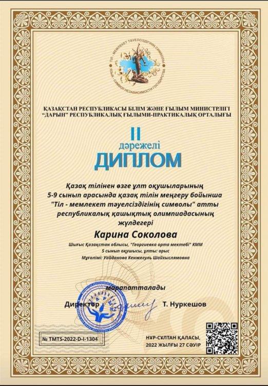Қазақстан Республикасы Білім және ғылым Министрлігі республикалық ғылыми – практикалық «Дарын»  орталығының ұйымдастыруымен 5-9 сынып арасында қазақ тілінен өзге ұлт оқушыларының қазақ тілін меңгеру бойынша «Тіл- мемлекет тәуелсіздігінің символы» атты республикалық  олимпиада өтті. Олимпиадаға мектебіміздің оқушылары белсене қатысты. Нәтижесінде, 9-сынып оқушысы Набережнева Алина мен 5- сынып оқушысы Ильина Виктория ІІІ дәрежелі, 7- сынып оқушысы Месерле Алёна мен 5- сынып оқушысы Соколова Карина ІІ дәрежелі, 6-сынып оқушысы Соловьёв Владислав пен 5- сынып оқушысы Клейн Лилия І дәрежелі Диплом иегерлері атанды. Жетекшілері қазақ тілі мен әдебиет пәні мұғалімдері А.С.Даулетова мен К.Ш.Уайданова.
