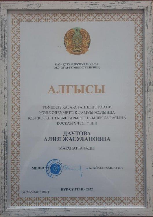Мектебіміздің орыс тілі мен әдебиеті пәні мұғалімі А.Ж.Даутова мен алғашқы әскери дайындық мұғалімі Д.М.Рахимгалиев Тәуелсіз Қазақстанның рухани және әлеуметтік дамуы жолында қол жеткен табыстары және білім саласына қосқан үлесі үшін Қазақстан Республикасы оқу-ағарту министрінің АЛҒЫС ХАТЫМЕН марапатталды. Марапат иелерін құттықтаймыз!