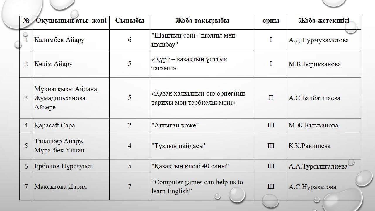 2022 жылдың 11 қазан күні 2-7 сынып оқушылар арасында облыстық "Зерде" зерттеу жұмыстары мен ғылыми жобалар конкурсының аудандық кезеңі өтті. Конкурсқа мектеп оқушылары белсене қатысып, төмендегідей нәтиже көрсетті. Оқушыларды, ата- аналарды, жетекшілерді жеңістерімен құттықтаймыз!