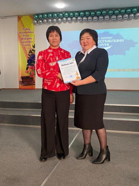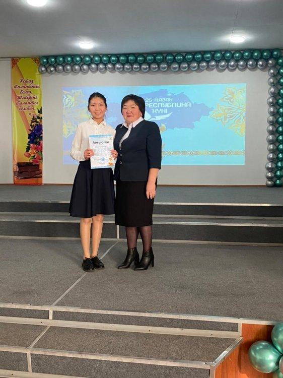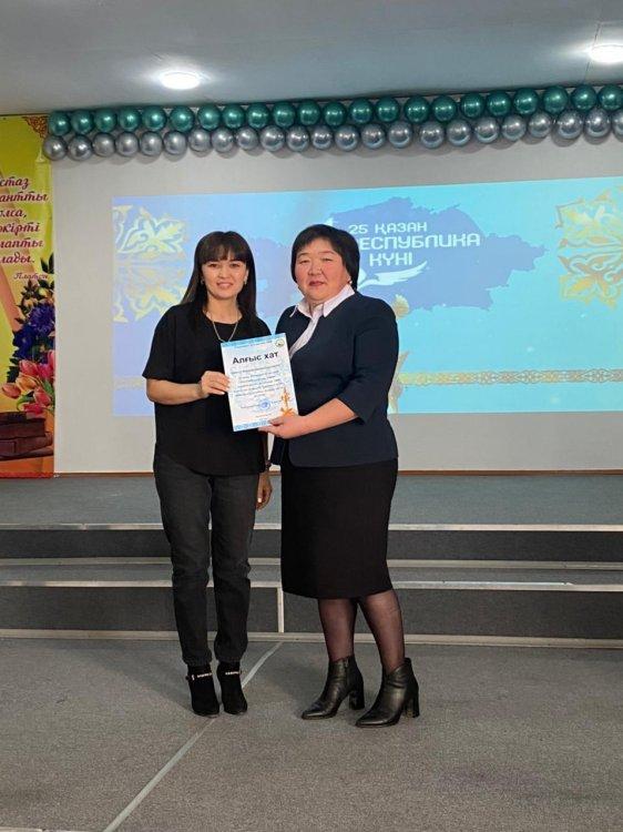 25 қазан - Республика күні мерекесіне орай мектебімізде "Отаным - бақыт мекенім" атты ата-аналар мен ұстаздарға арналған салтанатты жиын өтті. Жиынның құрметті қонағы ретінде мектепішілік қамқоршылық кеңесінің төрайымы А.К.Жармухаметова, мектепішілік қамқоршылық кеңесінің белсенді мүшелері М.А.Азбергенова мен Х.К.Садуов қатысты. 11-сынып оқушылары өз өнерлерін ортаға салып, мектептің қоғамдық өмірінде белсенділік танытқан ата-аналар мен оқушылар марапатталды.