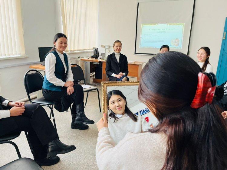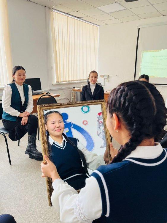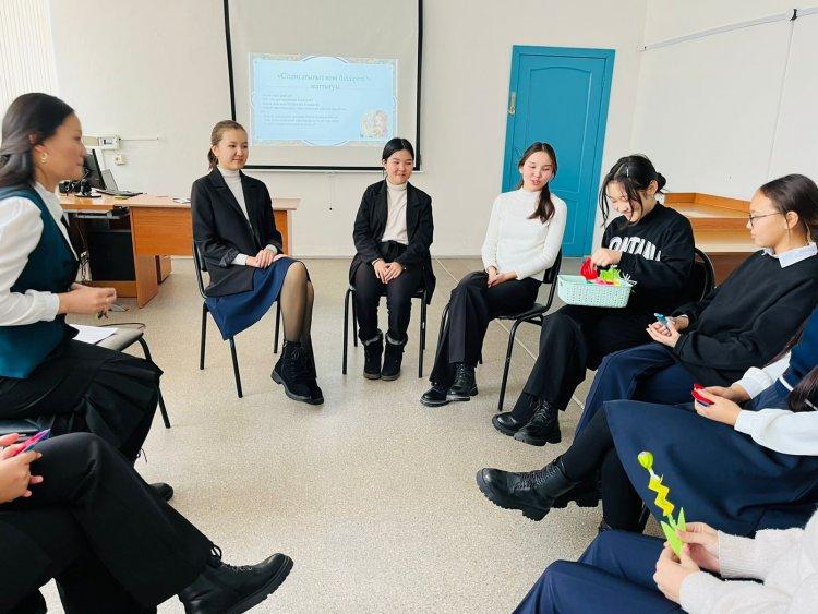 Республикалық «Зорлық- зомбылықсыз 16күн» акциясы аясында мектеп психологтары  А.Кокиева мен Б.Қабидоллаеваның ұйымдастыруымен қыз балалардың  бойына қыз бейнесіне тән мінез-құлық сипатын қалыптастыру, қыздардың бір-бірімен,  айналадағы ортамен үйлесімді қарым-қатынас жасауға дағдыландыру,  мәдени сөйлеу біліктілігін дамыту,  өзара жағымды қарым-қатынасын арттыру,  оларды адамгершілікке, шындыққа, достыққа, ұйымшылдыққа тәрбиелеу мақсатында «Әдемі күл, сыпайы жүр, сұлу ойлан» тақырыбында ашық әңгімелесу жүргізілді. Жұмыс барысында қыздардың көңіл-күйлері мен өзіне деген сенімділіктері артып,  өзіне деген дұрыс көзқарас қалыптастыруды үйренді. Жұмыс соңында «Ашығын айтсам..» жаттығуы арқылы бір-бірімен қарым-қатынастары арта түсті.