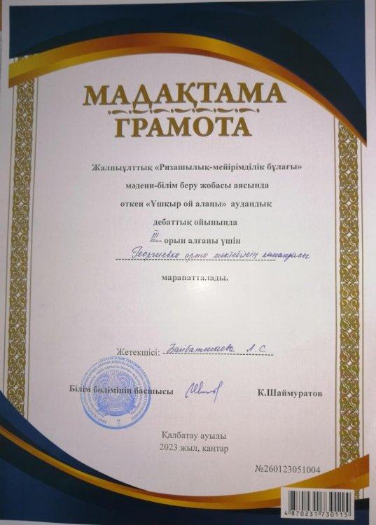 26 январь 2023 0 1 2 3 4 5 "Ұшқыр ой алаңы" аудандық дебаттық ойыны Жалпыұлттық "Ризашылық - мейірімділік бұлағы" мәдени-білім беру жобасы аясында өткен "Ұшқыр ой алаңы" аудандық дебаттық ойынында мектебіміздің командасы жүлделі ІІІ орынды иеленді. Жетекшісі Байбатшаева А.С.