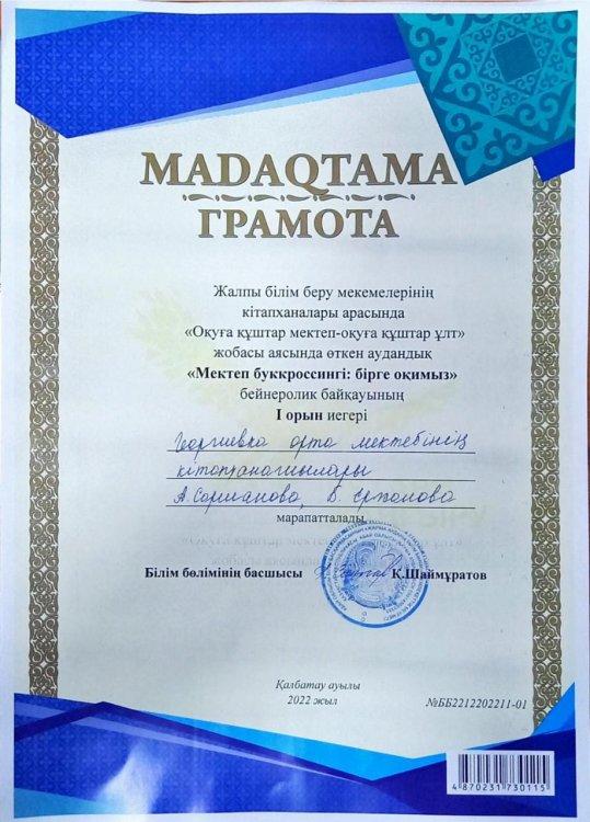 "Оқуға құштар мектеп" жобасы аясында жалпы білім беру мекемелері арасында өткен аудандық "Мектеп буккросингі: бірге оқимыз" бейнероликтер байқауында "Георгиевка орта мектебі" КММ-нің кітапханашылары Б.Т.Ержанова мен А.С.Саржанова жүлделі І орынға ие болды. Жеңімпаз иелерін құттықтап, шығармашылық табыс тілейміз.