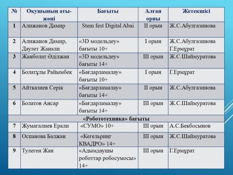 2023 жылдың 28 ақпан күні роботты құрастыру және бағдарламалау бойынша дарынды оқушыларды анықтау, қолдау мақсатында ұйымдастырылған «Zerek» облыстық чемпионатының және «Digital steam Abai» ІТ фестивалінің аудандық кезеңіне мектебіміздің оқушылары белсене қатысып, нәтижесінде жалпы есеп бойынша ЖҮЛДЕЛІ І ОРЫН иегерлері атанды. Әр бағыт бойынша жүлделі орын алған оқушылар мен жетекшілерін құттықтап, шығармашылық табыстар тілейміз!
