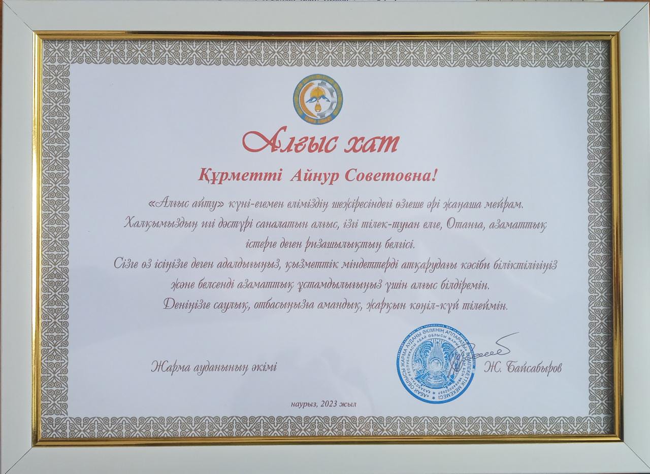 Байбатшаева А.С. аудан әкімі Ж.Байсабыровтың Алғыс хатымен марапатталды