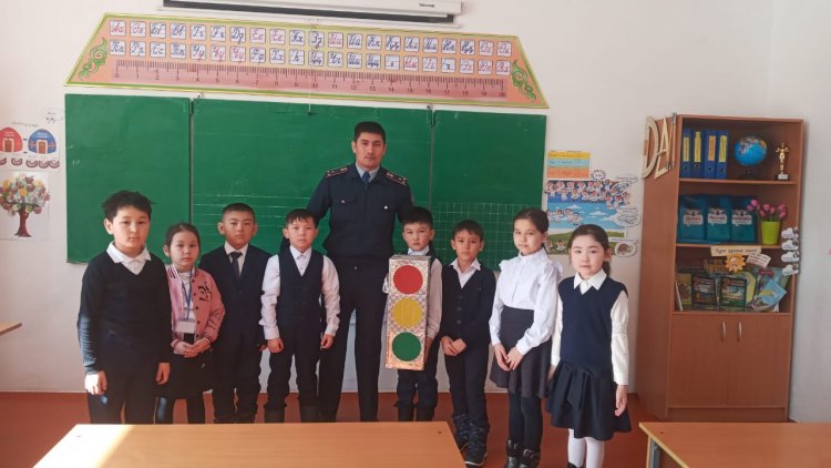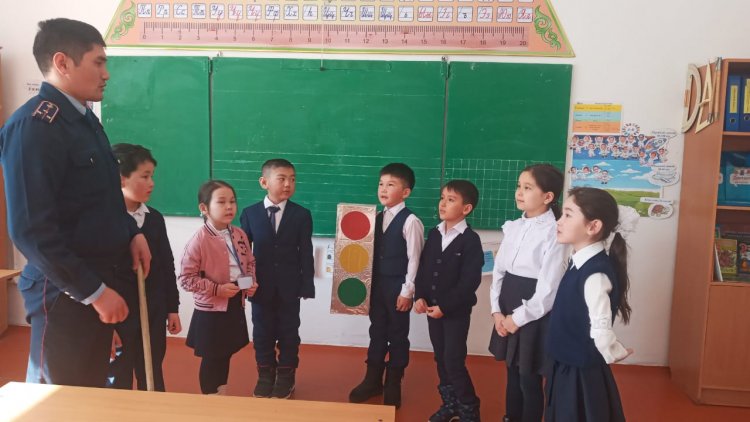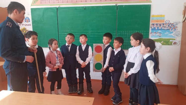 27 ақпан күні кәмелеттік жасқа толмағандар істері жөніндегі учаскелік полиция инспекторы Р.М.Мұратов 2-сынып оқушыларымен "Жолда жүру ережелері" тақырыбында әңгіме жүргізіп, жаяу жүргіншінің ұстанатын басты ережелері мен қағидаларына тоқталып өтті. Сұрақ-жауап түрінде балалардың білімдерін пысықтап, пайдалы ақпарат, кеңестерін айтты.
