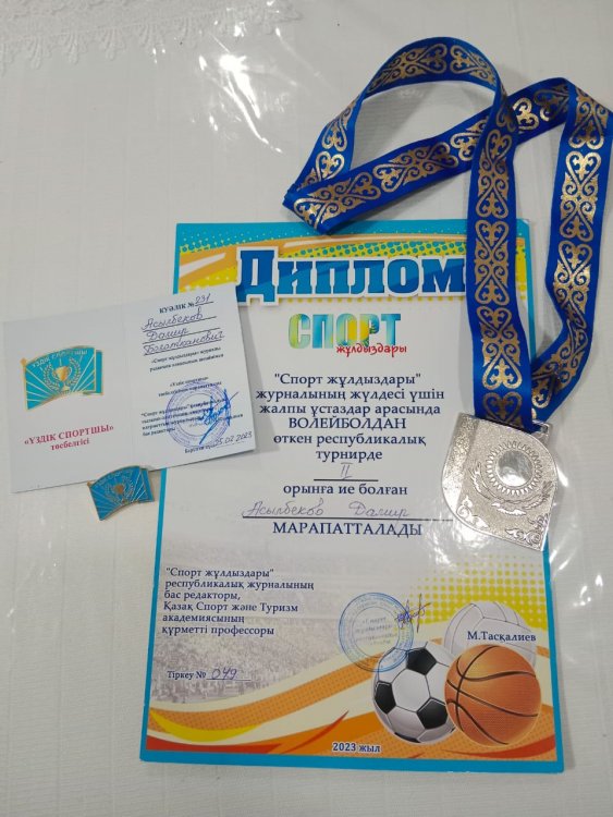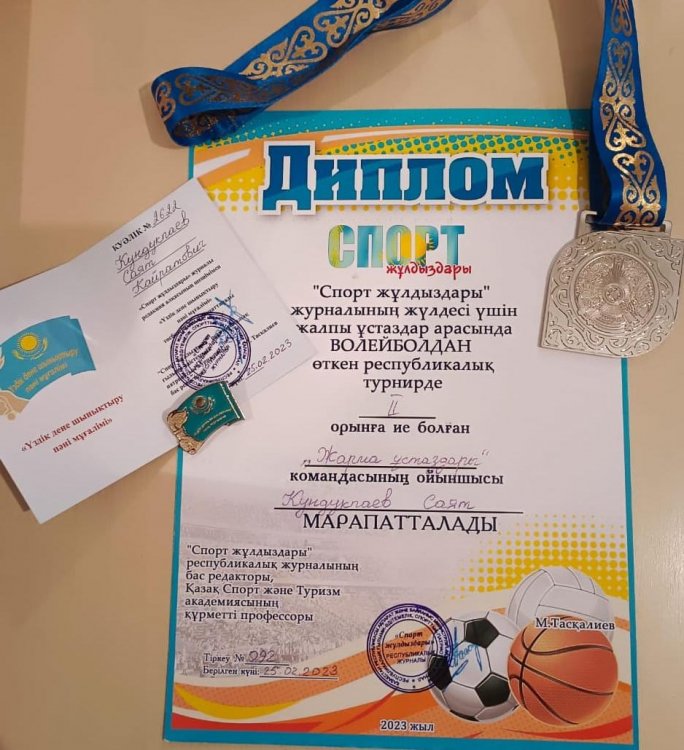 "Спорт жұлдыздары" журналының жүлдесі үшін жалпы ұстаздар арасында волейболдан өткен  РЕСПУБЛИКАЛЫҚ турнирде мектебіміздің дене шынықтыру пәнінің мұғалімдері  ІІ орынды иеленіп,  Д.Б.Асылбеков "ҮЗДІК СПОРТШЫ" куәлігіне және  С.К.Кундукпаев "ҮЗДІК ДЕНЕ ШЫНЫҚТЫРУ ПӘНІ МҰҒАЛІМІ" куәлігіне ие болды.  Марапат иелерін құттықтаймыз!
