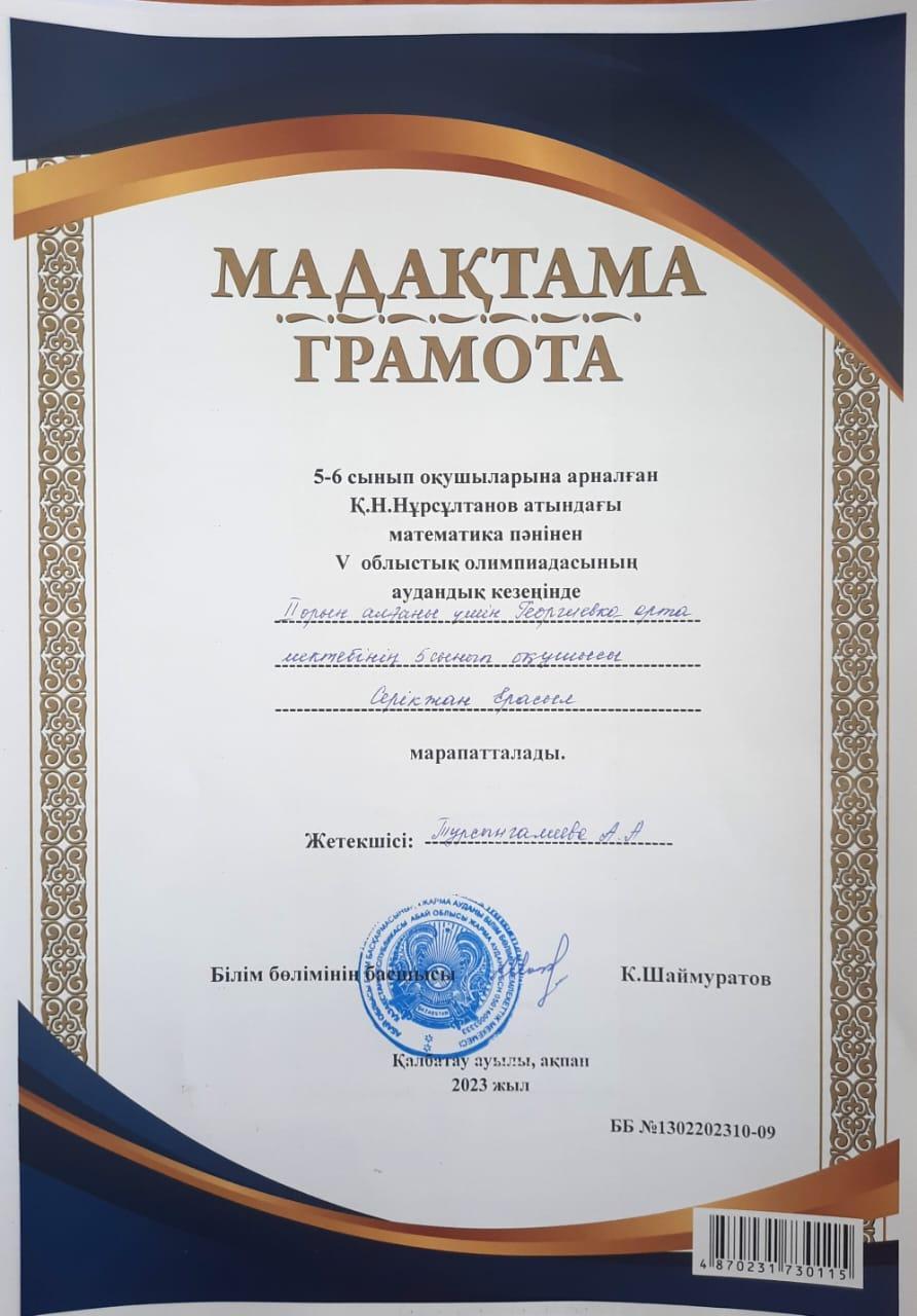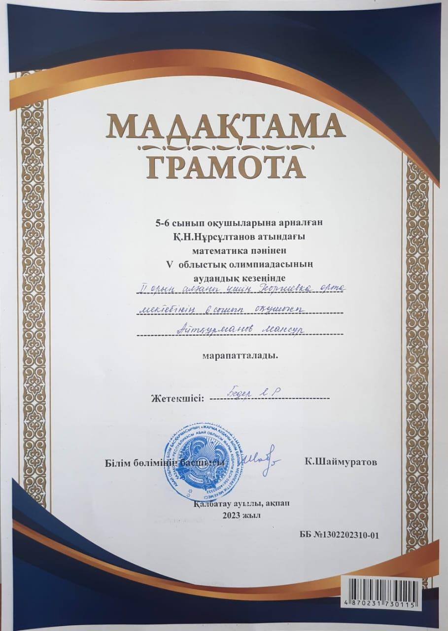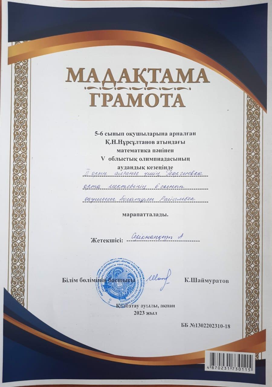 5-6 сынып оқушыларына арналған Қ.Нұрсұлтанов атындағы математика пәнінен V облыстық олимпиаданың аудандық кезеңінде мектебіміздің 5-сынып оқушысы Серікжан Ерасыл (жетекшісі Турсынгалиева А.А.), 6- сынып оқушылары Айтқұрманов Мансур (жетекшісі Бедер Л.Р.) мен Болатұлы Райымбек (жетекшісі Серікжанқызы А) жүлделі  ІІ орын иегерлері атанды. Оқушылар мен жетекшілерді құттықтаймыз!