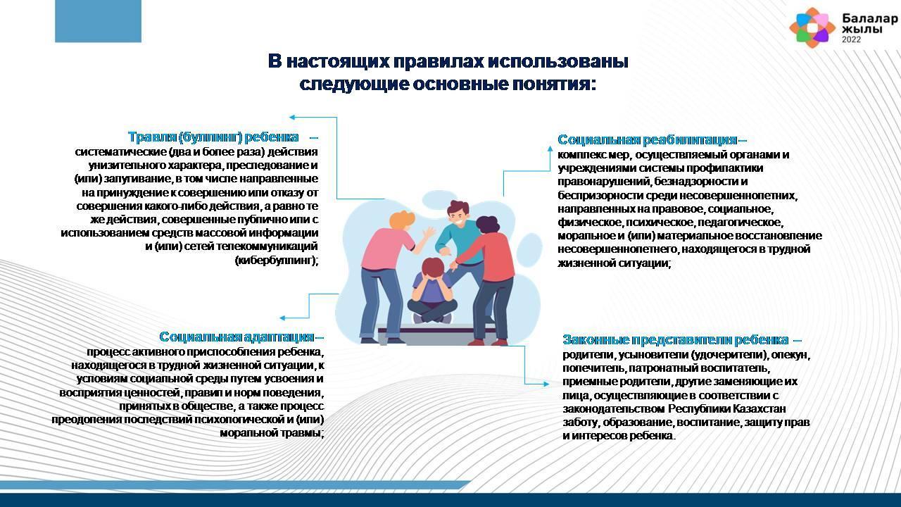 1) травля (буллинг) ребенка – систематические (два и более раза) действия унизительного характера, преследование и (или) запугивание, в том числе направленные на принуждение к совершению или отказу от совершения какого-либо действия, а равно те же действия, совершенные публично или с использованием средств массовой информации и (или) сетей телекоммуникаций (кибербуллинг);