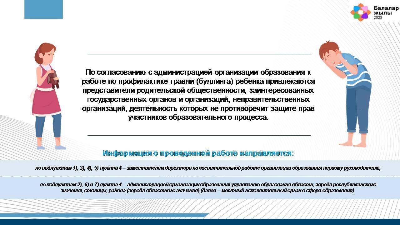 5. По согласованию с администрацией организации образования к работе по профилактике травли (буллинга) ребенка привлекаются представители родительской общественности, заинтересованных государственных органов и организаций, неправительственных организаций, деятельность которых не противоречит защите прав участников образовательного процесса.