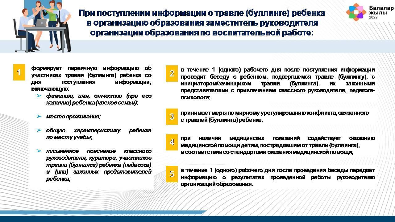 9. При поступлении информации о травле (буллинге) ребенка в организацию образования заместитель руководителя организации образования по воспитательной работе: