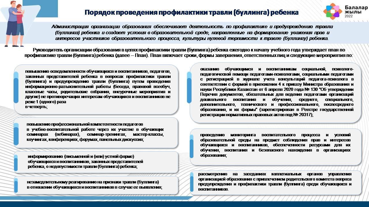 1) повышению осведомленности обучающихся и воспитанников, педагогов, законных представителей ребенка в вопросах профилактики травли (буллинга) и предупреждению травли (буллинга) путем проведения информационно-разъяснительной работы (беседа, правовой всеобуч, классные часы, родительские собрания, внеурочные мероприятия и другие) не противоречащих интересам обучающихся и воспитанников не реже 1 (одного) раза в четверть;