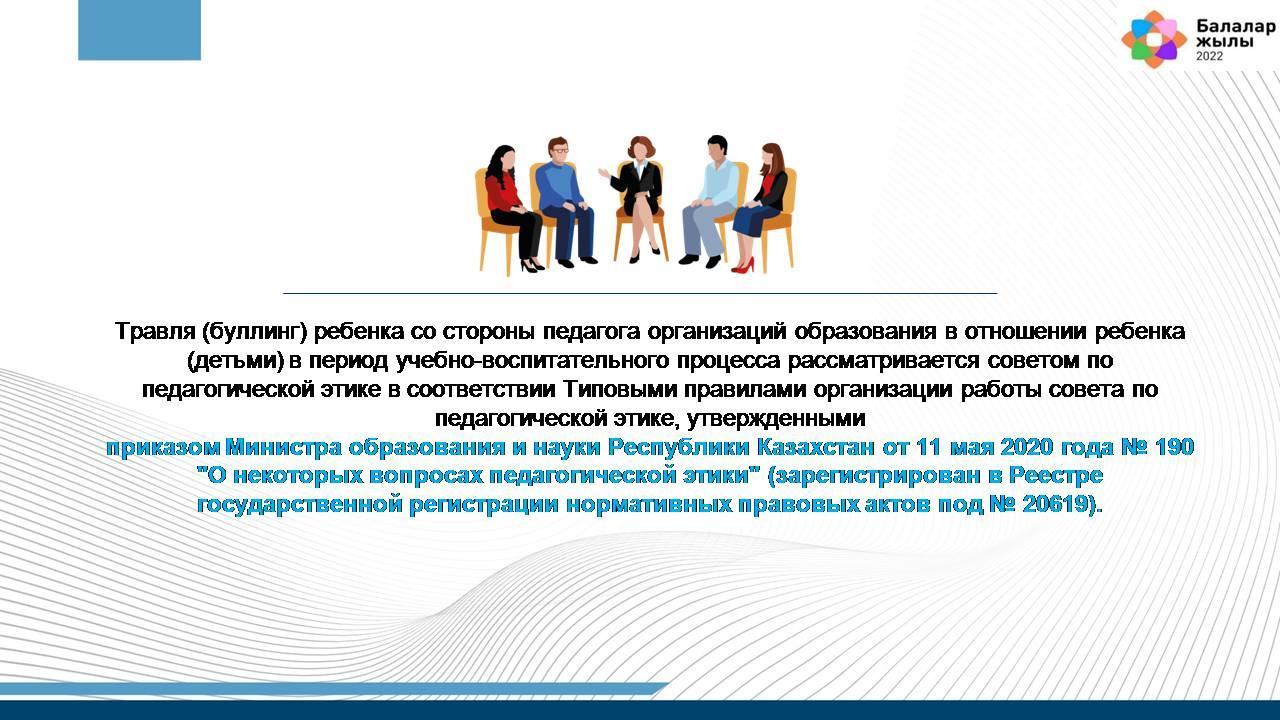 17. Травля (буллинг) ребенка со стороны педагога организаций образования в отношении ребенка (детьми) в период учебно-воспитательного процесса рассматривается советом по педагогической этике в соответствии Типовыми правилами организации работы совета по педагогической этике, утвержденными приказом Министра образования и науки Республики Казахстан от 11 мая 2020 года № 190 "О некоторых вопросах педагогической этики" (зарегистрирован в Реестре государственной регистрации нормативных правовых актов под № 20619).