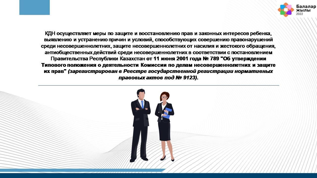 13. КДН осуществляет меры по защите и восстановлению прав и законных интересов ребенка, выявлению и устранению причин и условий, способствующих совершению правонарушений среди несовершеннолетних, защите несовершеннолетних от насилия и жестокого обращения, антиобщественных действий среди несовершеннолетних в соответствии с постановлением Правительства Республики Казахстан от 11 июня 2001 года № 789 "Об утверждении Типового положения о деятельности Комиссии по делам несовершеннолетних и защите их прав" (зарегистрирован в Реестре государственной регистрации нормативных правовых актов под № 9123).