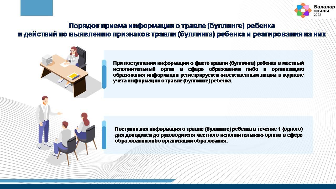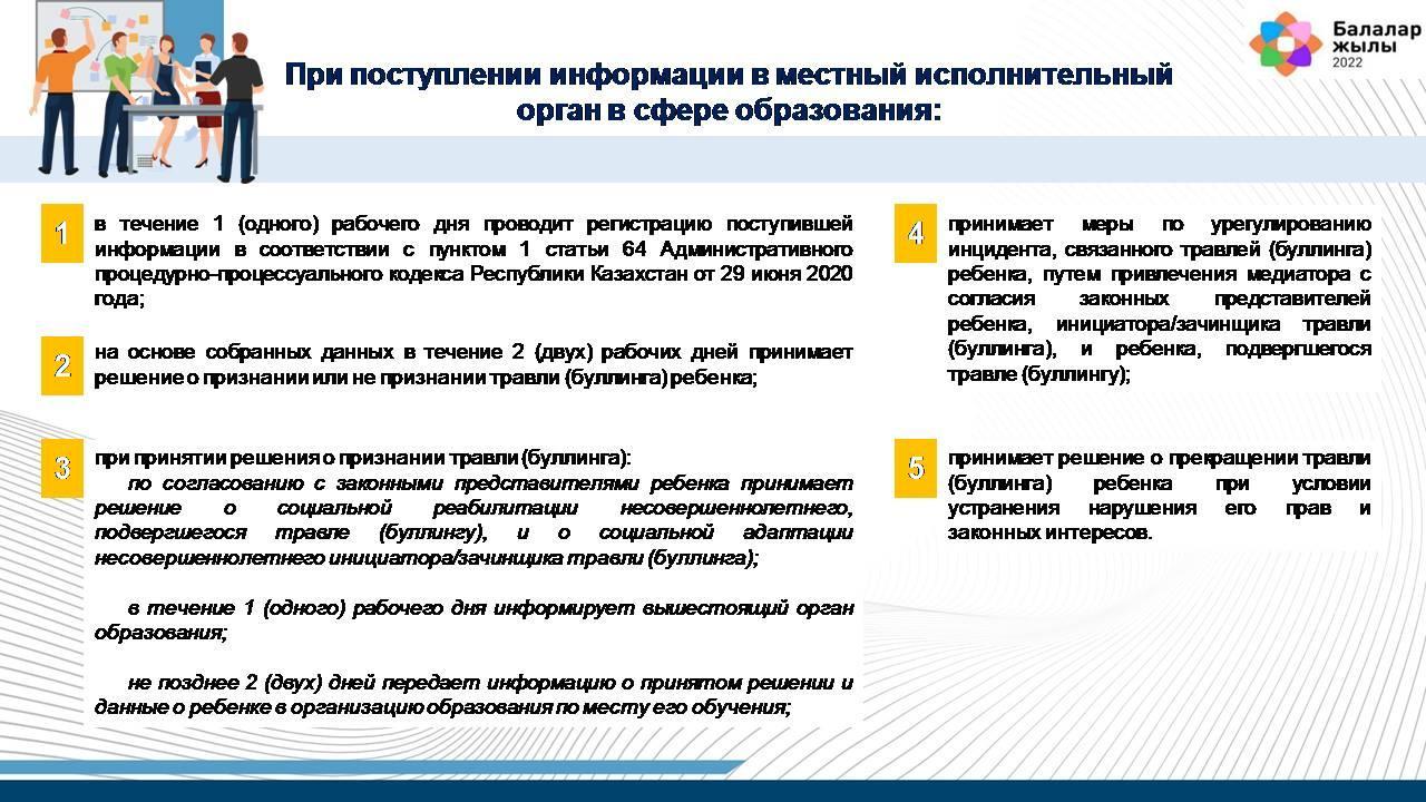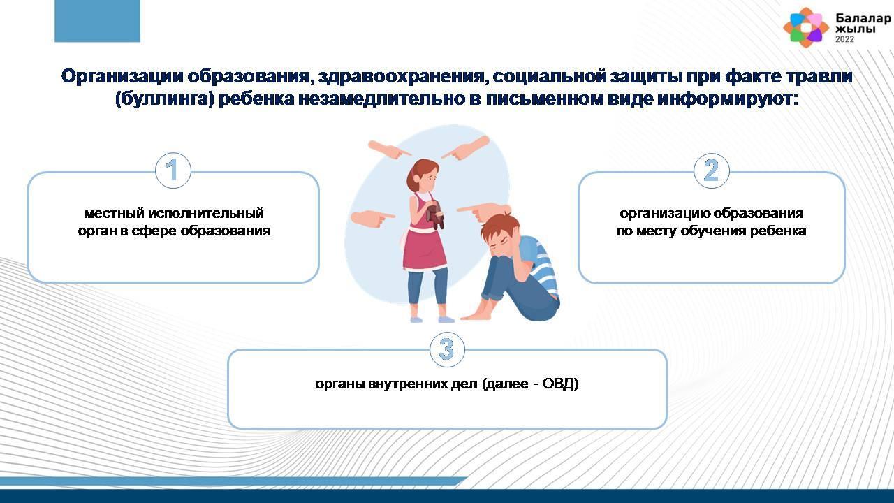 8. Поступившая информация о травле (буллинге) ребенка в течение 1 (одного) дня доводится до руководителя местного исполнительного органа в сфере образования либо организации образования.