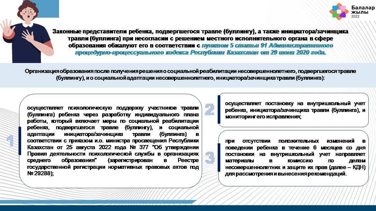 11. Законные представители ребенка, подвергшегося травле (буллингу), а также инициатора/зачинщика травли (буллинга) при не согласии с решением местного исполнительного органа в сфере образования обжалуют его в соответствии с пунктом 5 статьи 91 Административного процедурно-процессуального кодекса Республики Казахстан от 29 июня 2020 года.