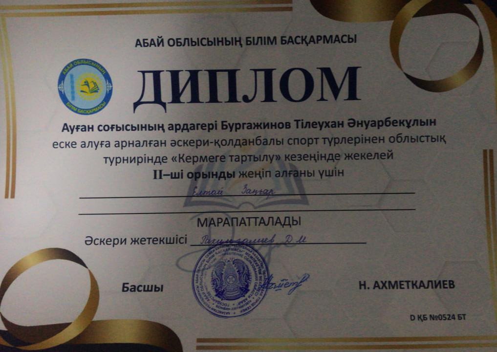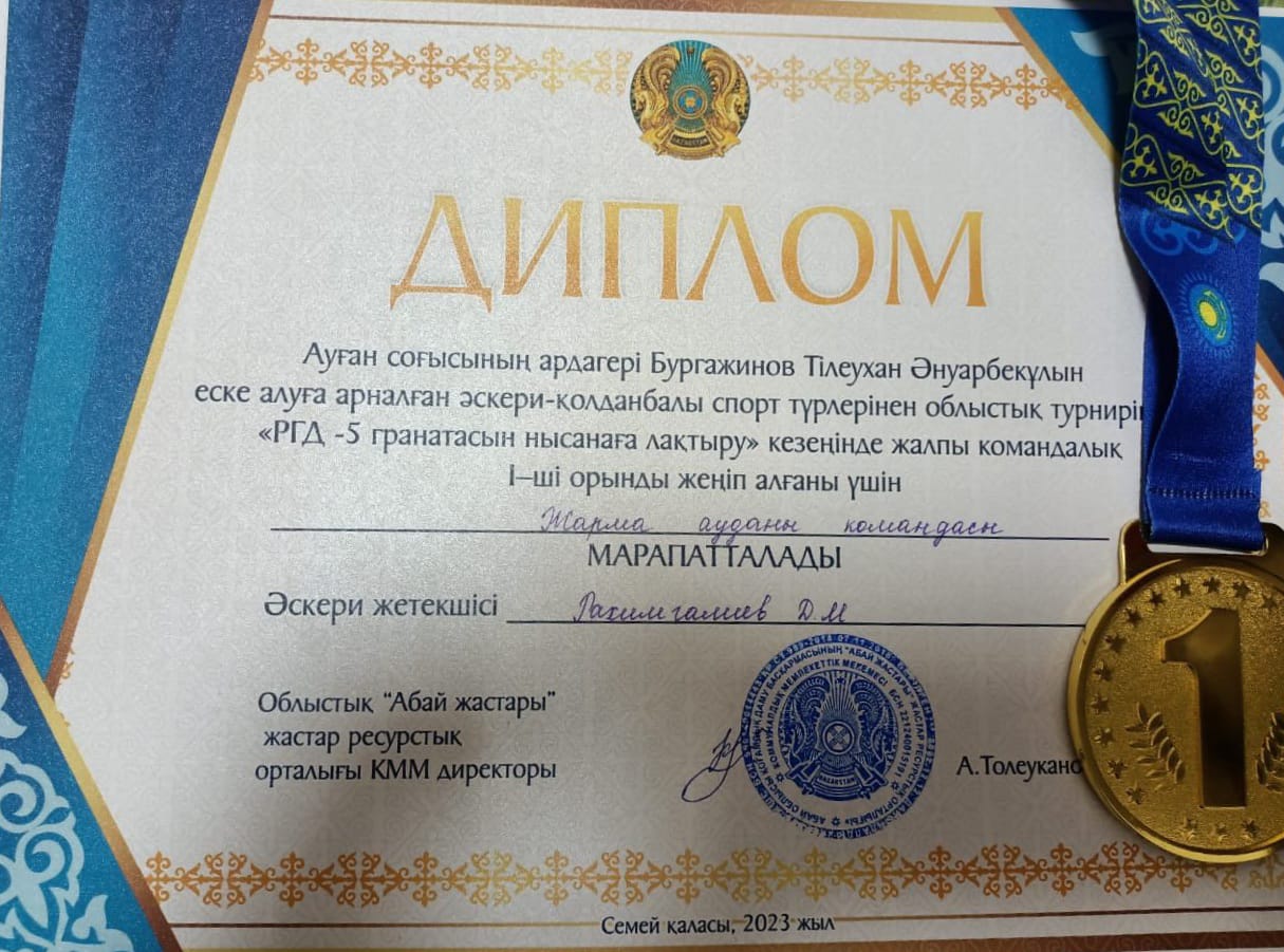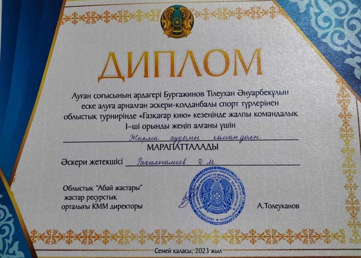 Ауған соғысының ардагері Бургажинов Тлеухан Әнуарбекұлын еске алуға арналған "Жас сарбаз" балалар-жасөспірімдер әскери-патриоттық қозғалысы тәбиеленушілері арасында облыстық әскери-қолданбалы спорт турнирінде Жарма ауданының командасы І орынды және БАС ЖҮЛДЕНІ жеңіп алды. Команда құрамында жекелей қатысып, І орын иеленген оқушыларымыз Рамазан Қарақат, Садуақасов Әкежан, Елтай Заңғар, Талапкер Санжар бар. Жетекшісі Рахимгалиев Д.М.