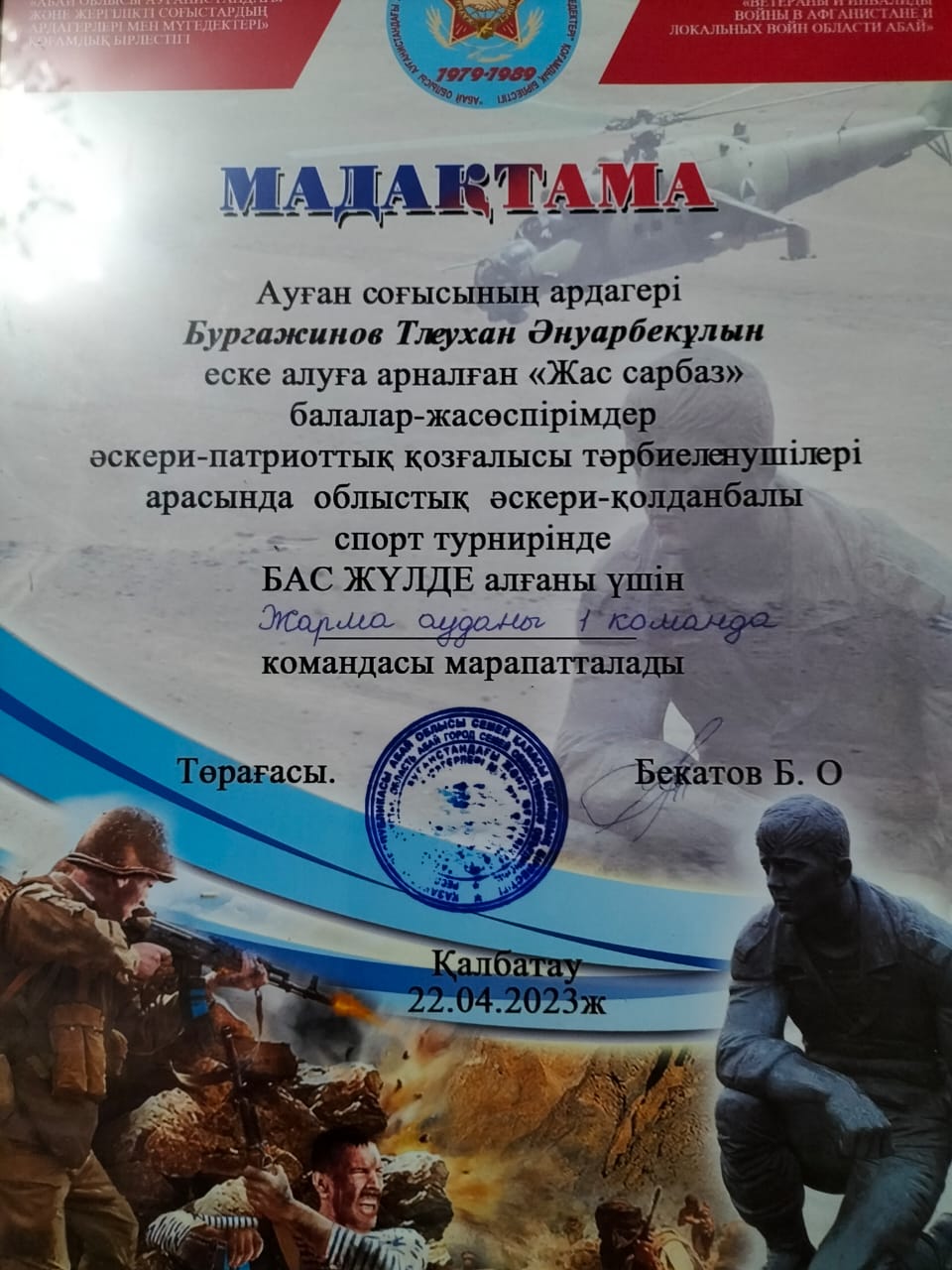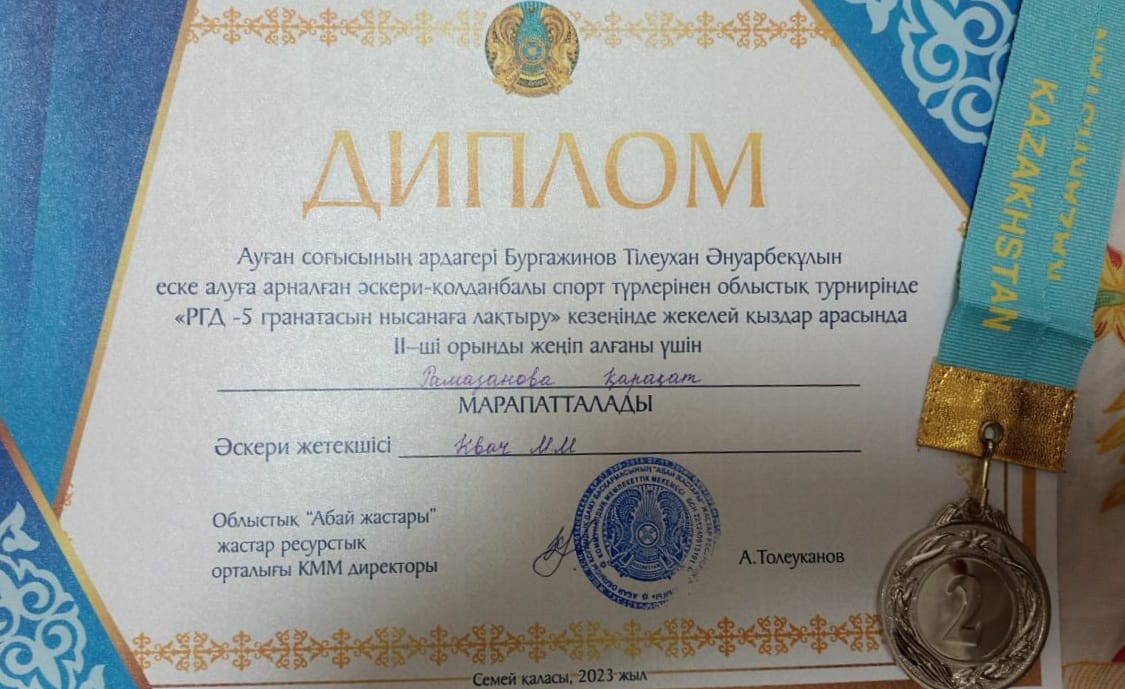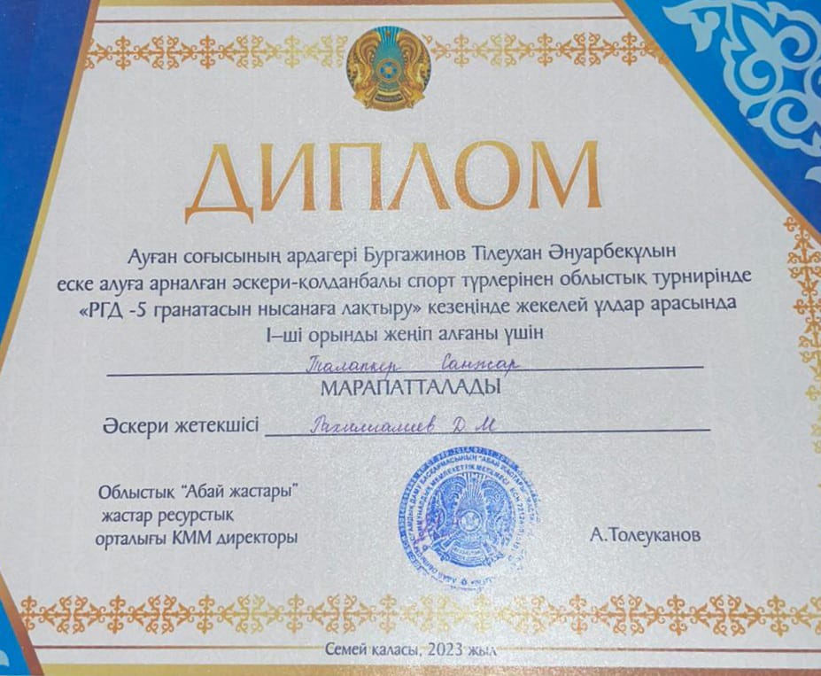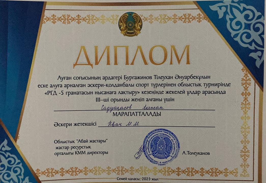Ауған соғысының ардагері Бургажинов Тлеухан Әнуарбекұлын еске алуға арналған "Жас сарбаз" балалар-жасөспірімдер әскери-патриоттық қозғалысы тәбиеленушілері арасында облыстық әскери-қолданбалы спорт турнирінде Жарма ауданының командасы І орынды және БАС ЖҮЛДЕНІ жеңіп алды. Команда құрамында жекелей қатысып, І орын иеленген оқушыларымыз Рамазан Қарақат, Садуақасов Әкежан, Елтай Заңғар, Талапкер Санжар бар. Жетекшісі Рахимгалиев Д.М.