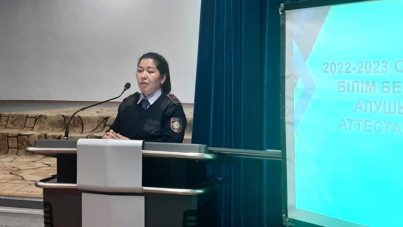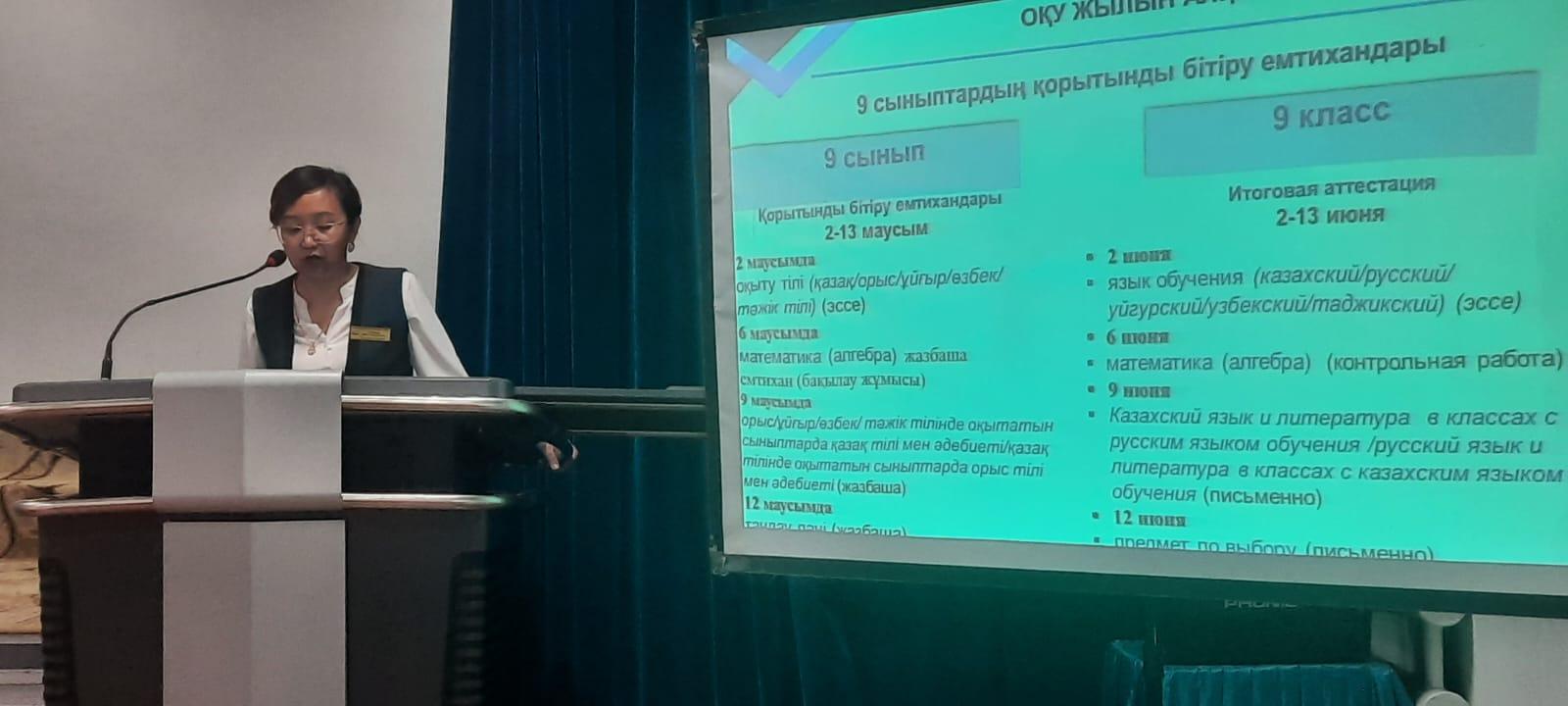2023 жылдың 2 мамыр күні 9,11-сынып оқушыларының ата-аналарына қорытынды аттестаттауды өткізу туралы түсіндірме жұмысын жүргізу мақсатында жиналыс өткізілді. Жиналыс барысында мектеп психологтары «Ата-ананың сенімі - балаға үлкен мотивация» тақырыбында ойын-жаттығуын жүргізіп, директордың оқу-тәрбие ісі жөніндегі орынбасары Б.А.Улыбаева 9, 11-сынып оқушыларының қорытынды аттестаттау тапсыру мерзімдері мен өткізілу форматын таныстырды. Кәмелеттік жасқа толмағандар аға инспекторы, полиция майоры А.М.Акимбаева құқықбұзушылықтың алдын алу бойынша жүргізілетін жұмыстар туралы ақпарат берді. Жиналыс соңында ата- аналардың сұрақтарына жауап берілді.