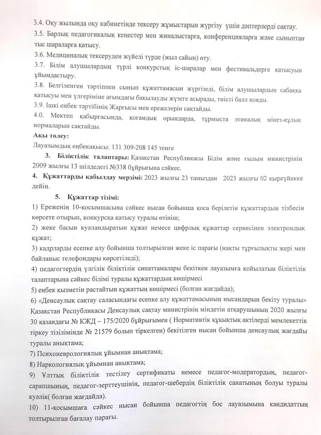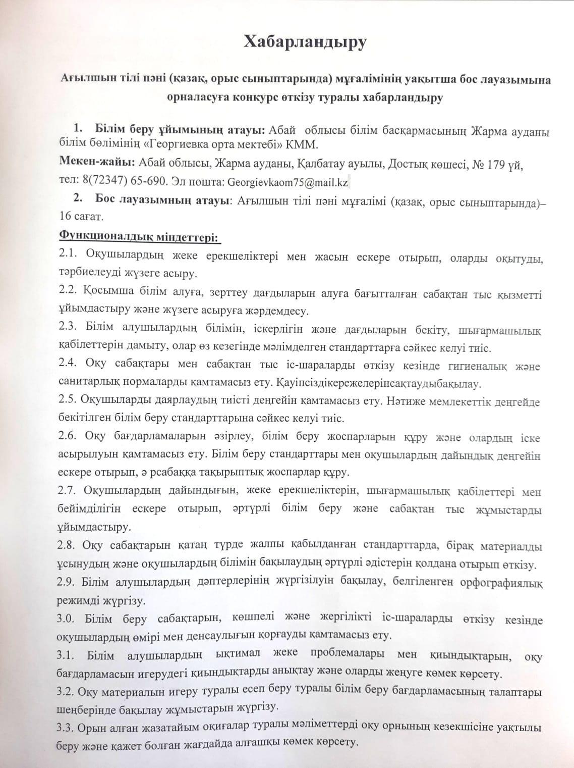 Ағылшын тілі (қазақ, орыс сыныптарында) мұғалімінің уақытша бос лауазымына орналасуға конкурс өткізу туралы хабарландыру » «Георгиевка орта мектебі» КММ