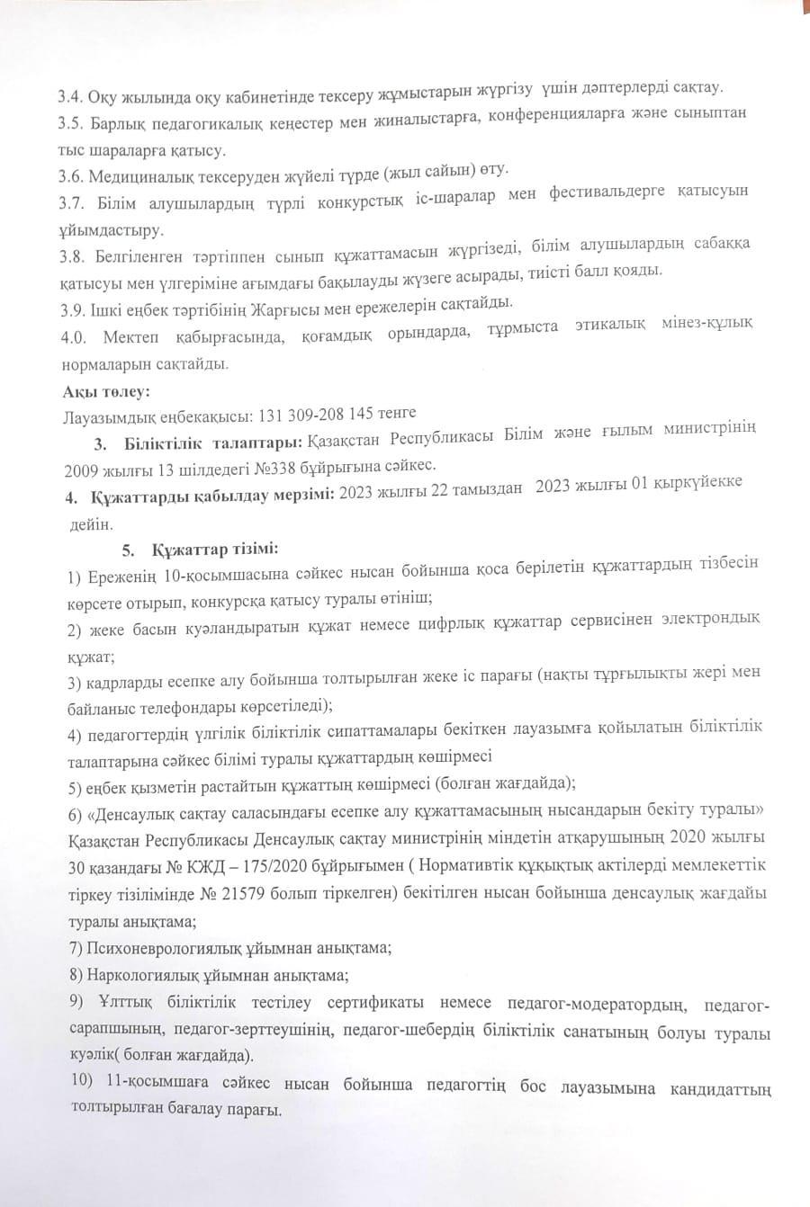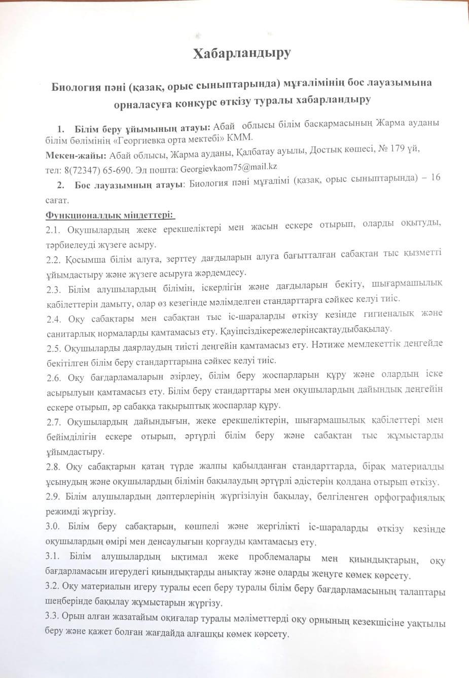 22 август 2023 0 1 2 3 4 5 Биология пәні мұғалімінің бос лауазымына орналасуға конкурс жариялау туралы хабарлама