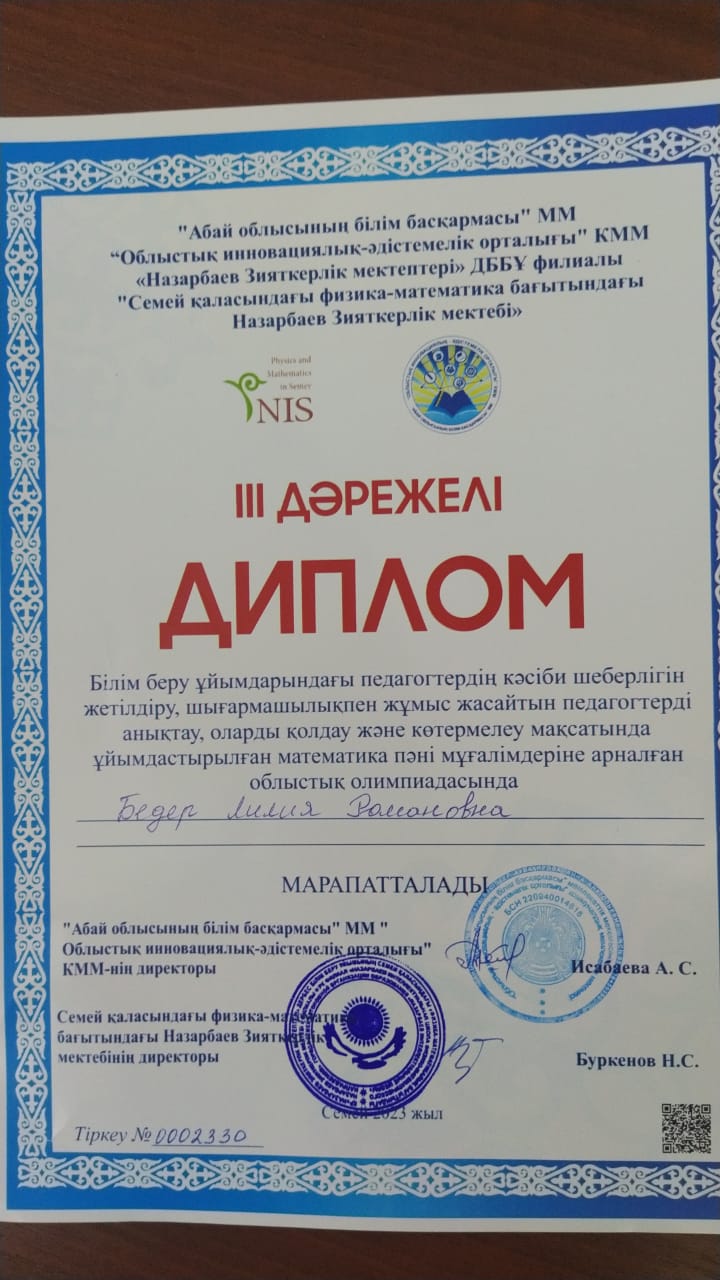 2023 жылдың 14 қазан күні математика пәні мұғалімдеріне арналған облыстық олимпиада өтті. Олимпиадаға мектебіміздің математика пәні мұғалімі Бедер Лилия Романовна қатысып, жүлделі ІІІ орын иегері атанды. Әріптесімізді жеңісімен құттықтаймыз!