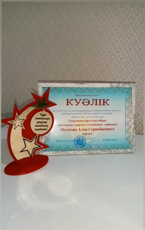 2022-2023 оқу жылының қорытындысы бойынша бәсекеге қабілетті, жан-жақты дамыған, білімді, парасатты оқушыларды тәрбиелеудегі жетістіктері үшін мектепалды даярлық сынып тәрбиешісі Мусатова Алма Серикбаевна Жарма ауданы білім бөлімінің «Үздік мектепалды даярлық сыныбының тәрбиешісі» Куәлігімен марапатталды. Құттықтаймыз!