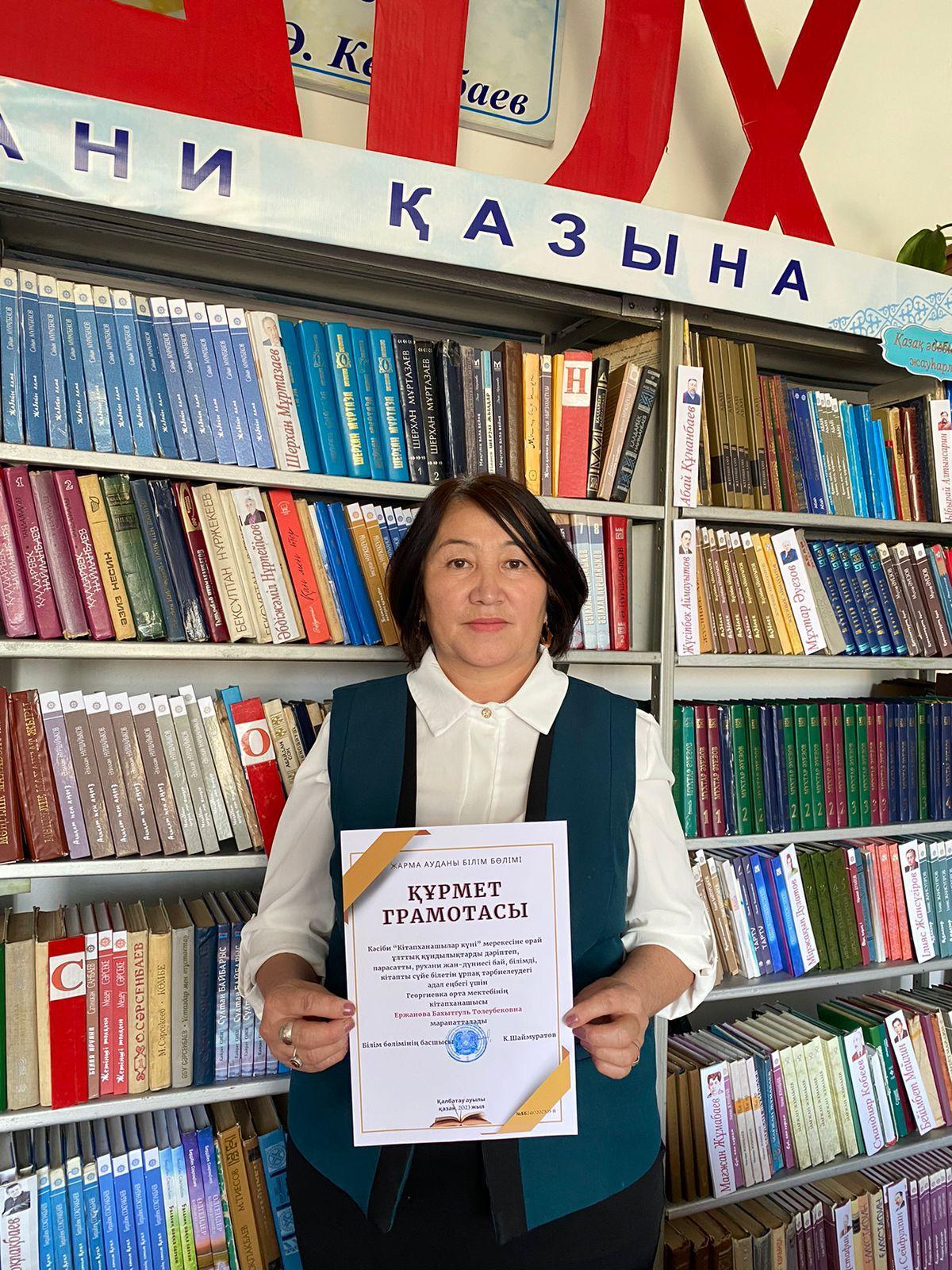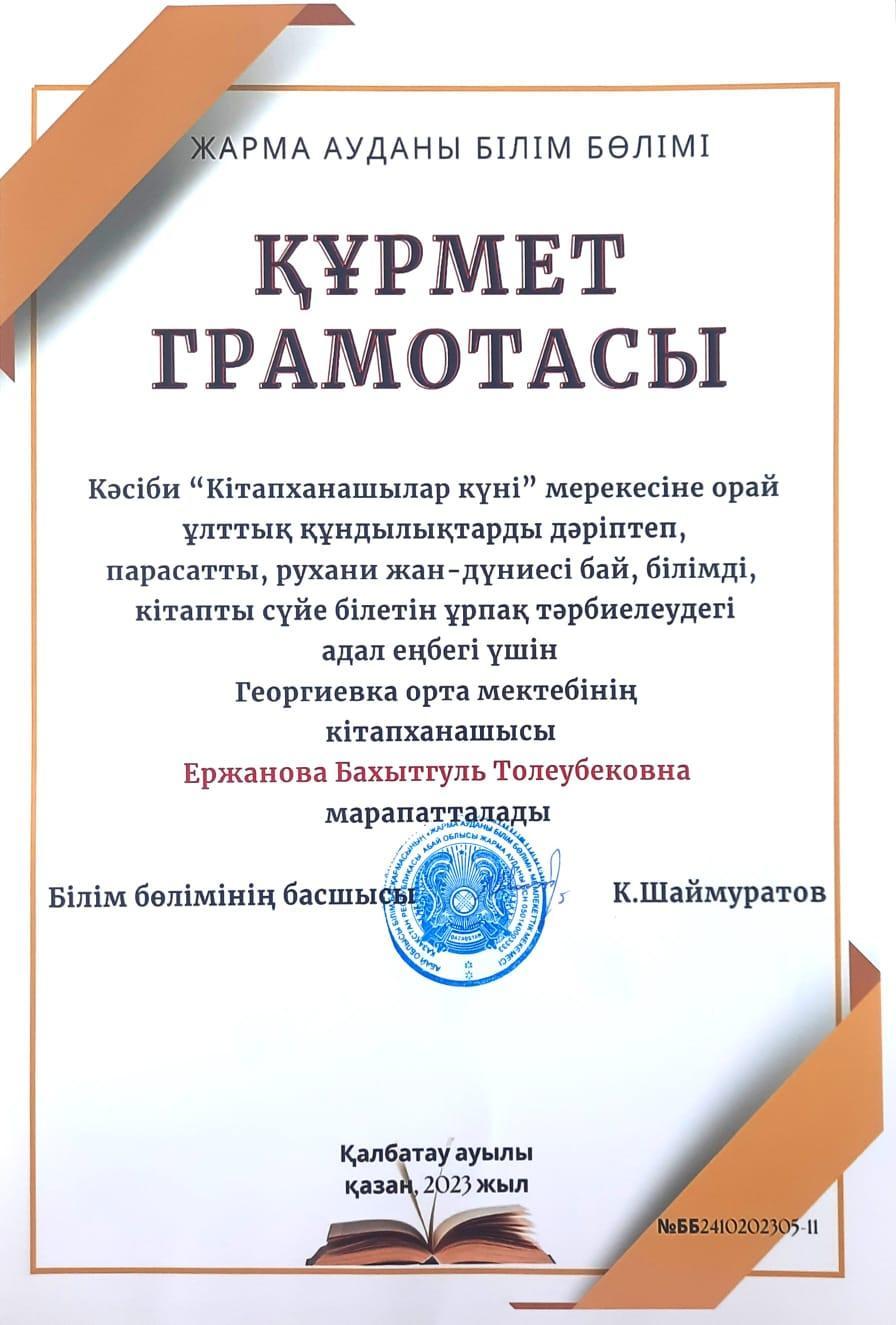 Кәсіби "Кітапханашылар күні" мерекесіне орай ұлттық құндылықтарды дәріптеп, парасатты, рухани жан-дүниесі бай, білімді, кітапты сүйе білетін ұрпақты тәрбилеудегі адал еңбегі үшін мектеп кітапханашысы Бахытгуль Толеубековна Жарма ауданы білім бөлімінің Құрмет грамотасымен марапатталды. Құттықтаймыз!