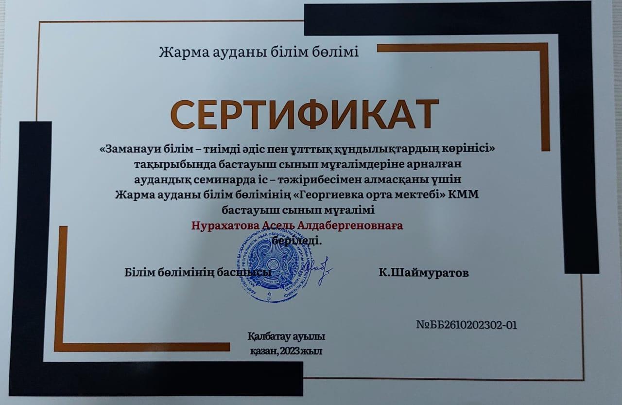 2023 жылдың 26 қазан күні «Заманауи білім- тиімді әдіс пен ұлттық құндылықтардың көрінісі» тақырыбында бастауыш сынып мұғалімдеріне арналған аудандық семинарда Нурахатова Асель Алдабергеновна өзінің іс-тәжірибесімен бөлісіп, сертификат иеленді.