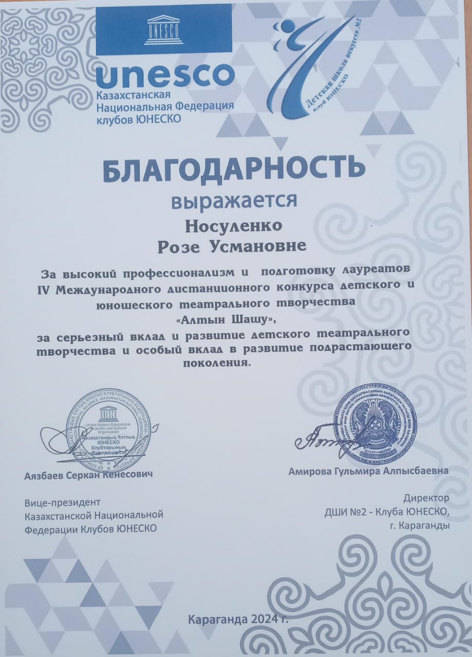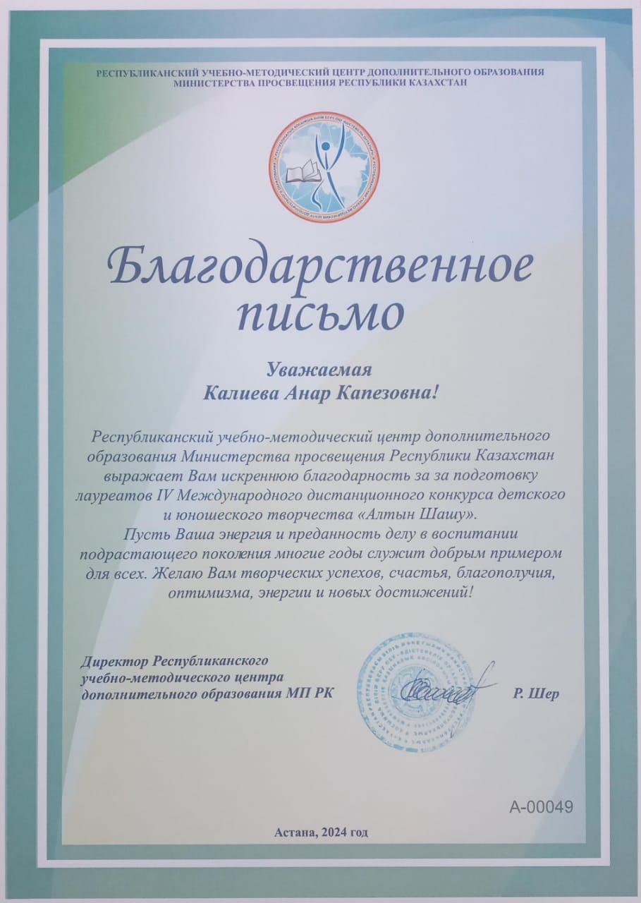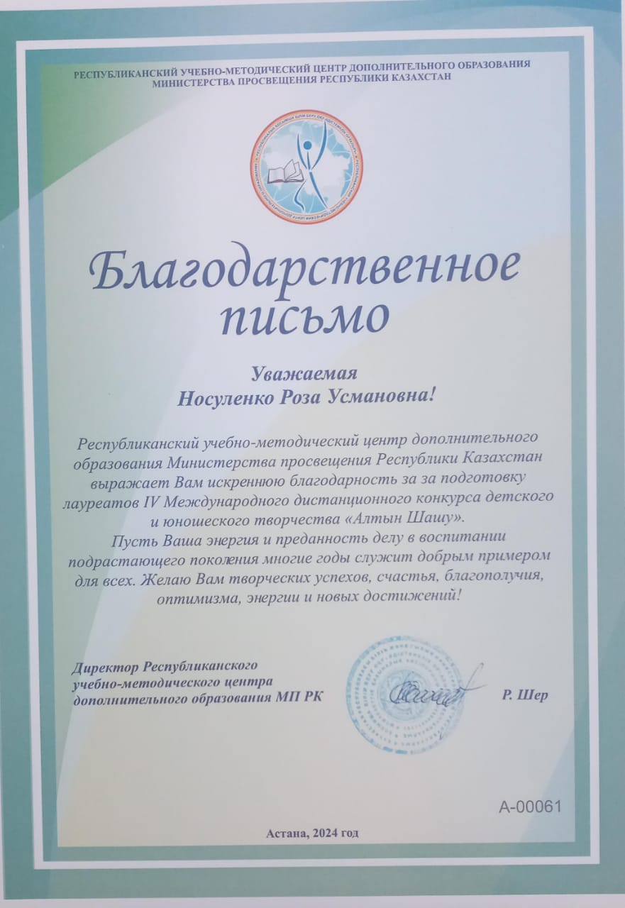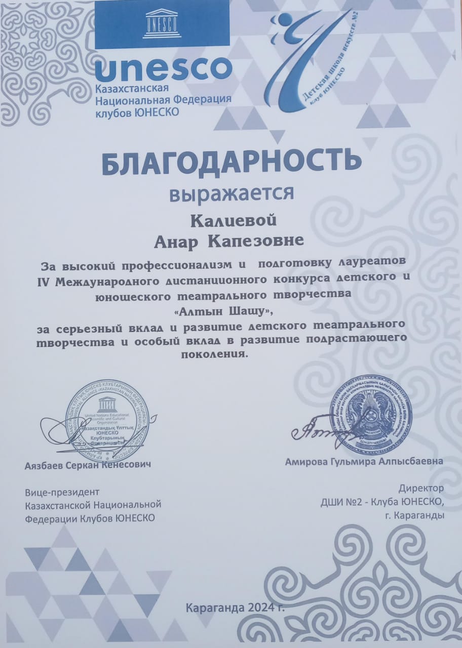IV Халықаралық  байқауына мектебіміздің 4-сынып оқушыларынан құралған қуыршақ театры "Ертегілер сандығы" тобы  қатысып, жүлделі І дәрежелі дипломмен және жетекшілері Р.У.Носуленко мен А.К.Калиева Қазақстан Республикасы Парламенті Мәжілісінің Республикалық қосымша білім беру оқу-әдістемелік орталығының директоры Р.Шердің Алғыс хатымен марапатталды. Марапат иелерін құттықтап, шығармашылық табыс тілейміз!