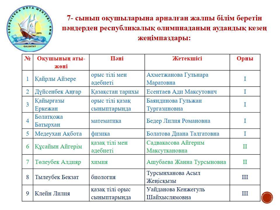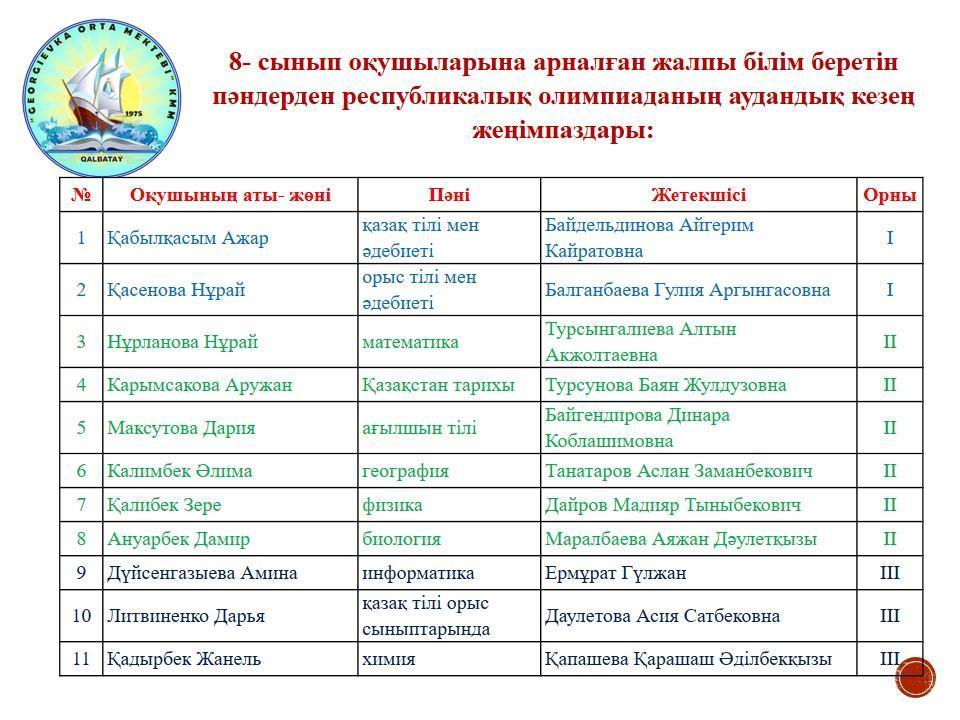 2024 жылдың 7-8 ақпан күндері 7-8 сынып оқушыларына арналған жалпы білім беретін пәндер бойынша республикалық олимпиаданың аудандық кезеңі өтті. Олимпиадаға мектебіміз бойынша 24 оқушы қатысып, 7 оқушы І орын, 8 оқушы ІІ орын, 5 оқушы 3 орын иеленді.