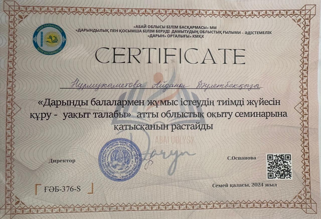Абай облысы білім басқармасының «Дарындылық пен қосымша білім беруді дамытудың ғылыми- әдістемелік «Дарын» орталығының ұйымдастыруымен «Дарынды балалармен жұмыс істеудің тиімді жүйесін құру- уақыт талабы» тақырыбында облыстық оқу семинары өтті. Семинарға мектебіміздің тарих пәні мұғалімі Нурмухаметова Айдана Дәулетбекқызы қатысып, сертификат иеленді.