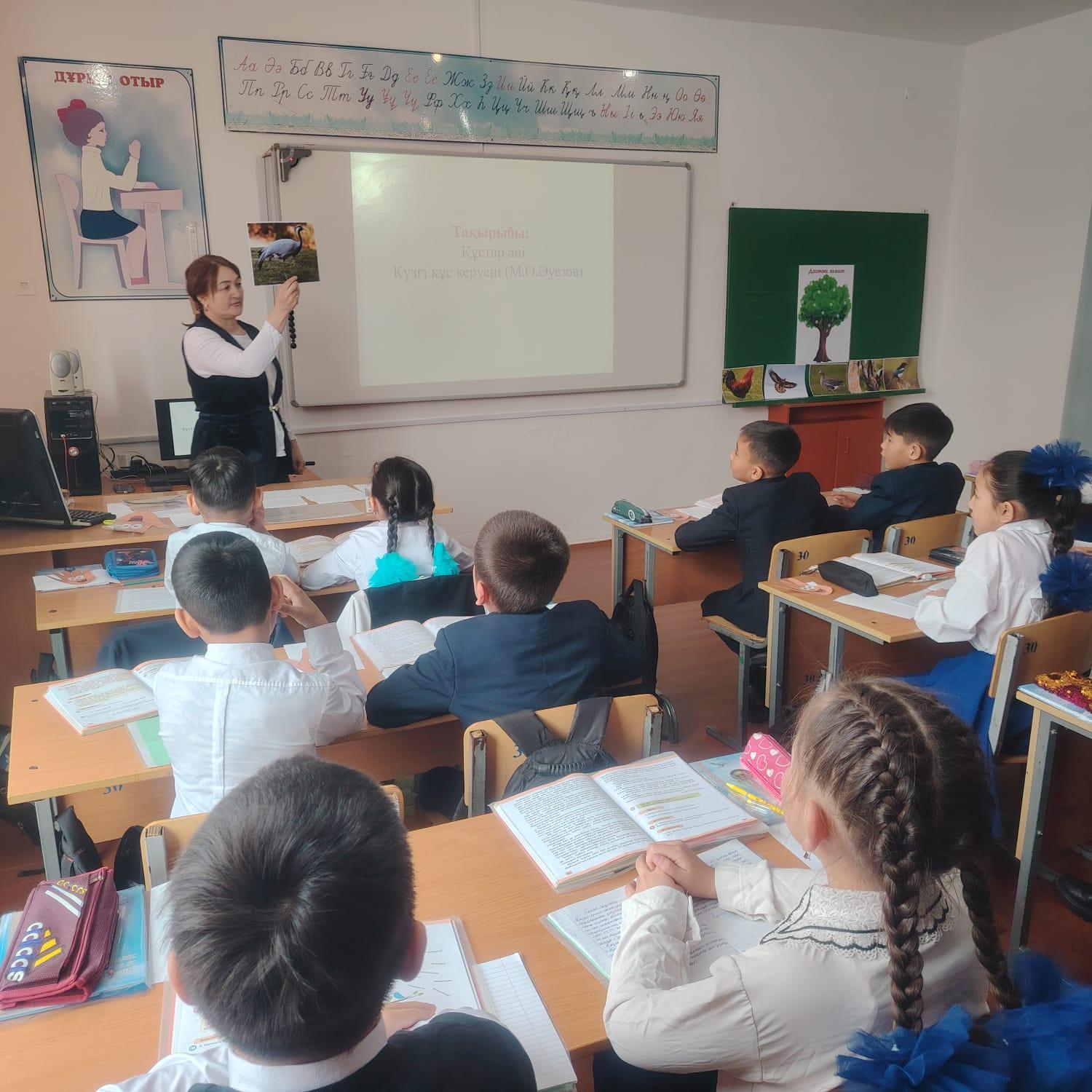 2024 жылдың 26 ақпан күні апталық аясында бастауыш сынып мұғалімі Нурашева Миргуль Шайкеновна 4 «Д» сыныбында әдебиеттік оқу пәнінен «Құстар әні» тақырыбына ашық сабақ өткізді. Сабақта жекелей, жұптық, топтық жұмыстар жүргізу барысында «Фортуна» әдісі, «Ойыңмен бөліс», «Сөйлем құрастыр» айдары, «Шығарманың сыры» әдістері тиімді қолданылды. Сабақ соңында «Достық ағашына» құстарды қондыру арқылы кері байланыс жүргізілді. Ерекше білім беруді қажет ететін оқушыға жекелей тапсырма беріліп, бағаланды.