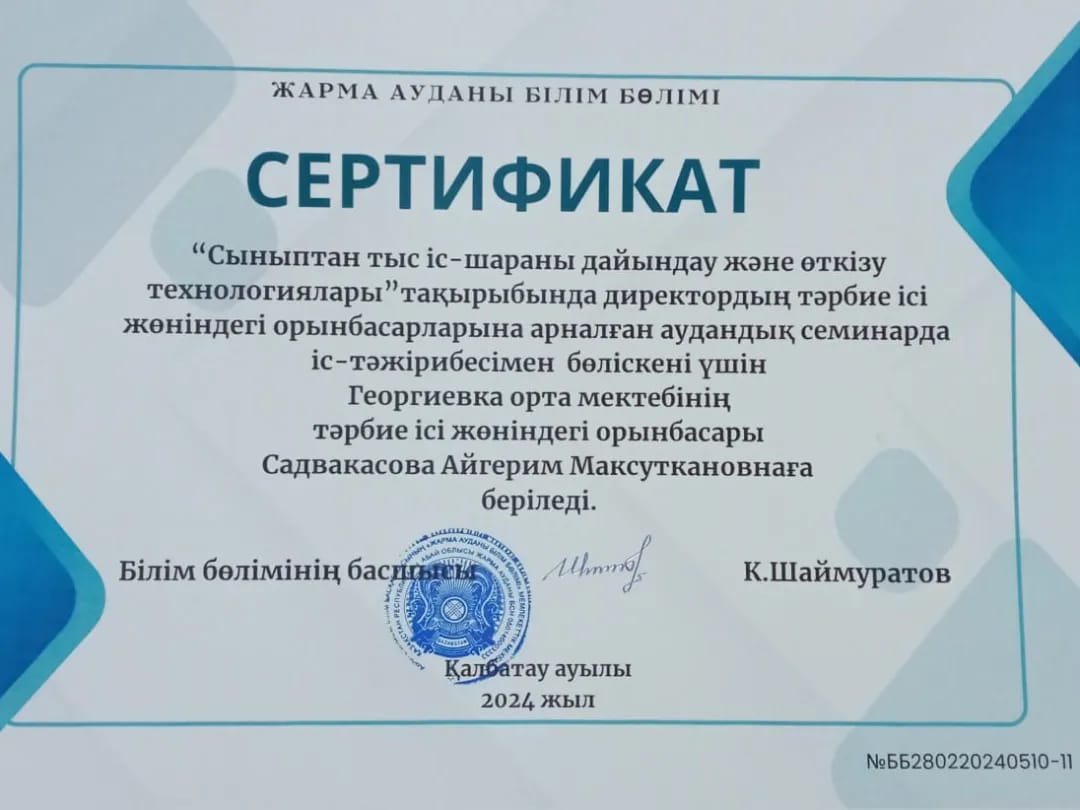 2024 жылдың 28 ақпан күні "Сыныптан тыс іс-шараны дайындау және өткізу технологиялары" тақырыбында директорлардың тәрбие ісі жөніндегі орынбасарларына арналған аудандық семинарда Садвакасова Айгерим Максуткановна "Тиімді үйірме- сапалы іс-шара кепілі" тақырыбында іс-тәжірибемен бөліскені үшін Жарма ауданы білім бөлімінің Сертификатымен марапатталды.