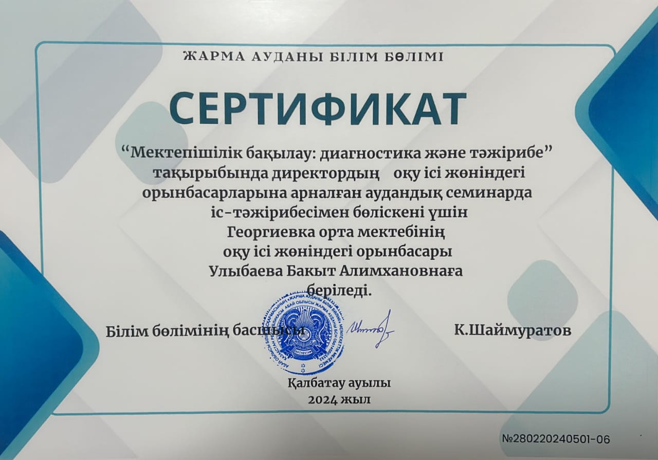 2024 жылдың 28 ақпан күні "Мектепішілік бақылау: диагностика және тәжірибе" тақырыбында директорлардың оқу ісі жөніндегі орынбасарларына арналған аудандық семинарда Улыбаева Бакыт Алимхановна "«Action research – тиімді тәжірибеден табысқа жету»" тақырыбында іс-тәжірибемен бөліскені үшін Жарма ауданы білім бөлімінің Сертификатымен марапатталды.