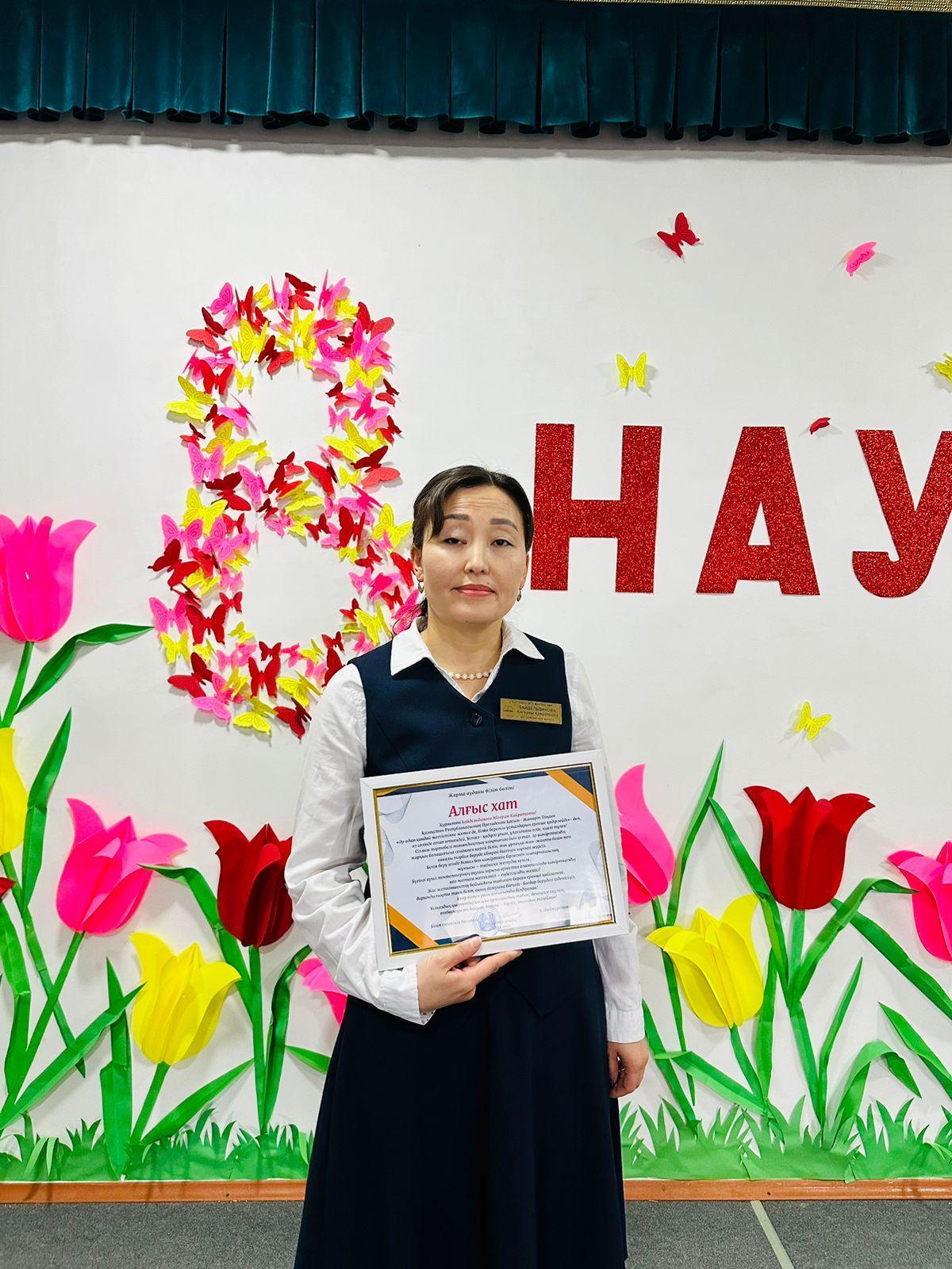 Ауыл мектептерінің 9-11 сынып оқушыларына арналған олимпиадада шәкіртінің жеткен жетістігі үшін мектебіміздің қазақ тілі мен әдебиеті пәні мұғалімі, олимпиаданың республикалық кезеңінде үздік нәтиже көрсеткен Бекбосын Аружанның жетекшісі Байдельдинова Айгерим Кайратовна Жарма ауданы білім бөлімінің Алғыс хатымен марапатталды. Әріптесімізді құттықтап, шығармашылық табыс тілейміз!