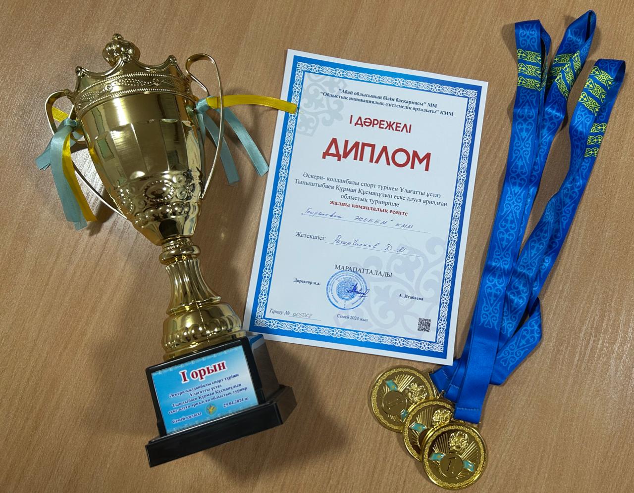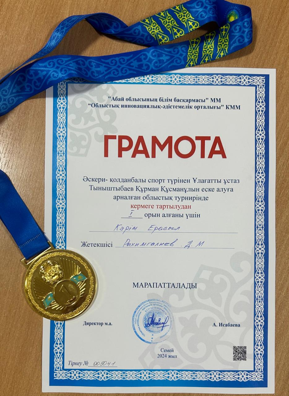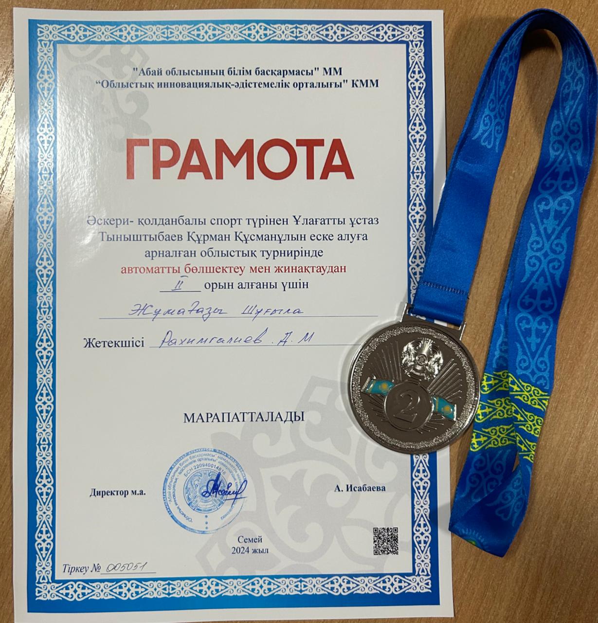 "Абай облысының білім басқармасы"ММ мен "Облыстық инновациялық-әдістемелік орталығы"КММ-нің ұйымдастыруымен өткен әскери-қолданбалы спорт түрінен Ұлағатты ұстаз Тыныштыбаев Құрман Құсманұлын еске алуға арналған облыстық турнирге мектебіміздің оқушылары белсене қатысып,  автоматты бөлшектеу  мен  жинақтаудан  Жұмағазы Шұғыла ІІ орынды, кермеге тартылудан Кәрім Ерасыл І орынды иеленсе, жалпыкомандалық есепте  жүлделі І орынды жеңіп алды. Жетекшісі Рахимгалиев Д.М.