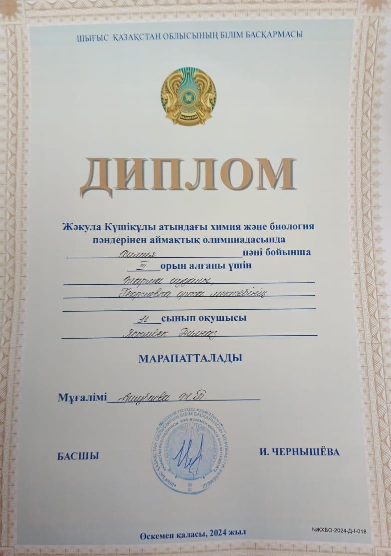 2024 жылдың 23 сәуір күні Өскемен қаласында Ж.Күшікұлы атындағы химия және биология пәндерінен аймақтық олимпиада өтті. Олимпиадаға мектебіміздің 11-сынып оқушысы Ясымбек Дилназ химия пәнінен қатысып, ІІІ орын иегері атанды. Жетекшісі Ашубаева Жанна Турсыновна.